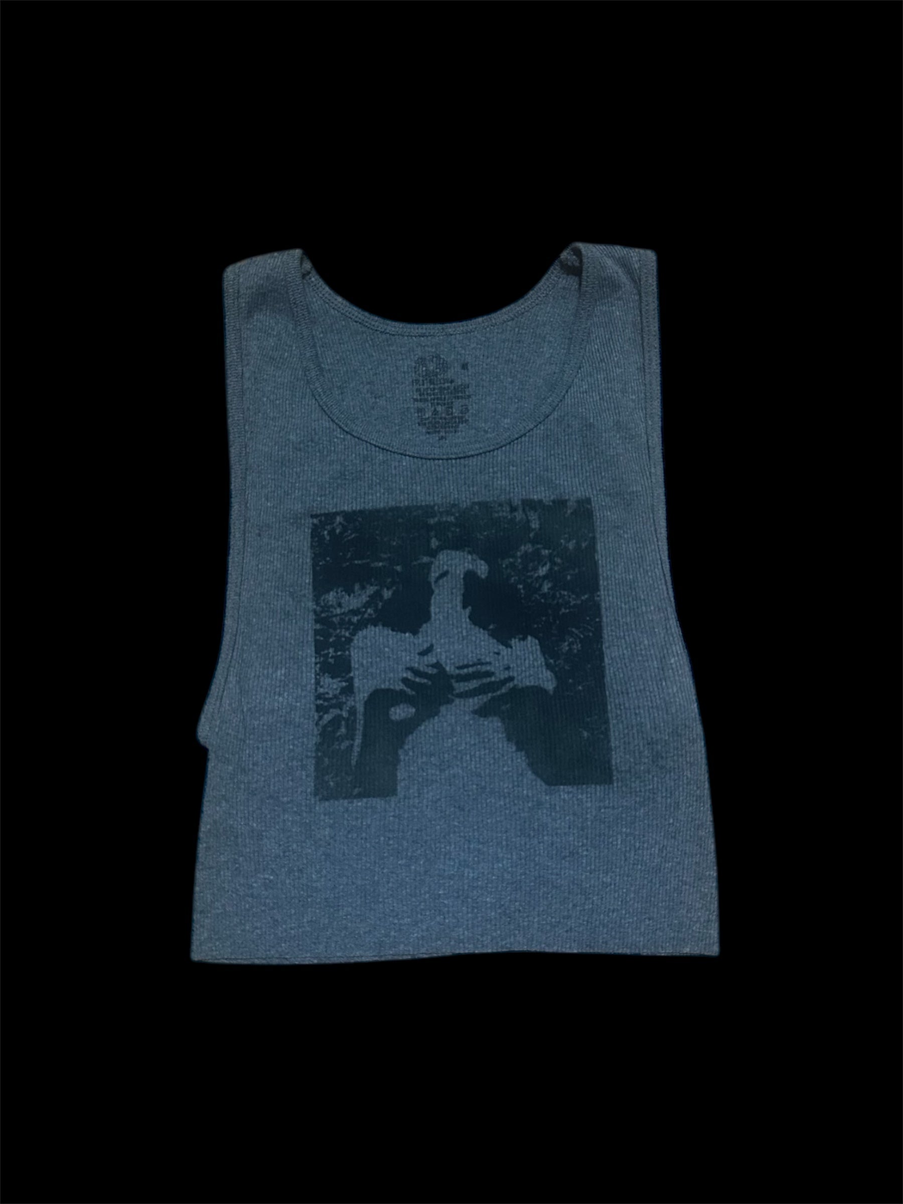 Dark grey ribbed cropped tank top with a handprinted graphic of a topless women laying down and covering herself.
