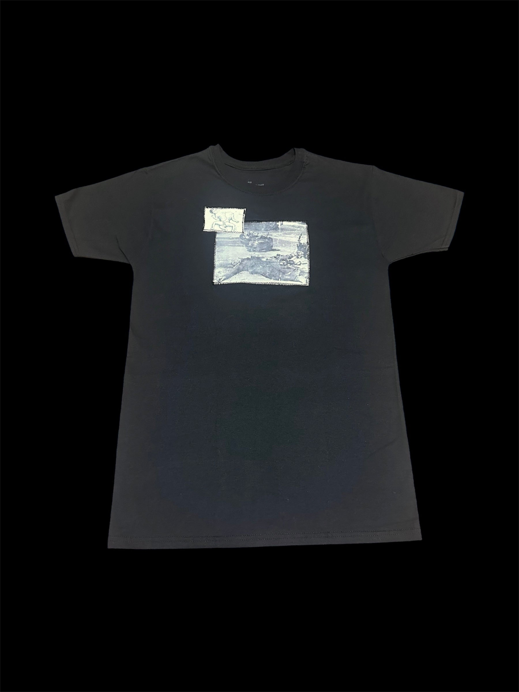 Black cotton t-shirt with two handmade patches made from vintage LIFE magazine photos.