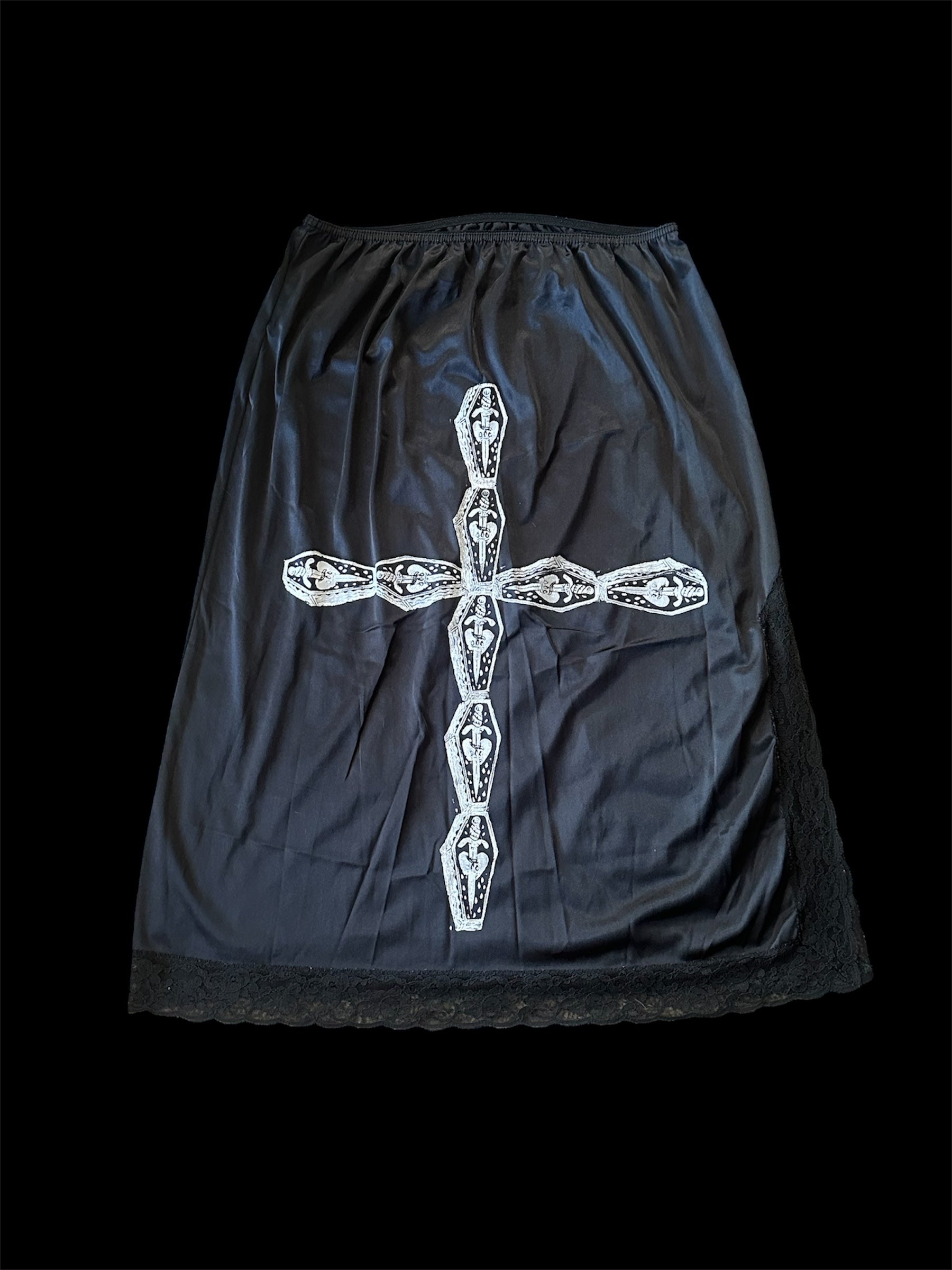 Reversible black satin maxi skirt with coffin crossΒ linocut printed design, and two handmade patches on the back sewn on with safety pin details.