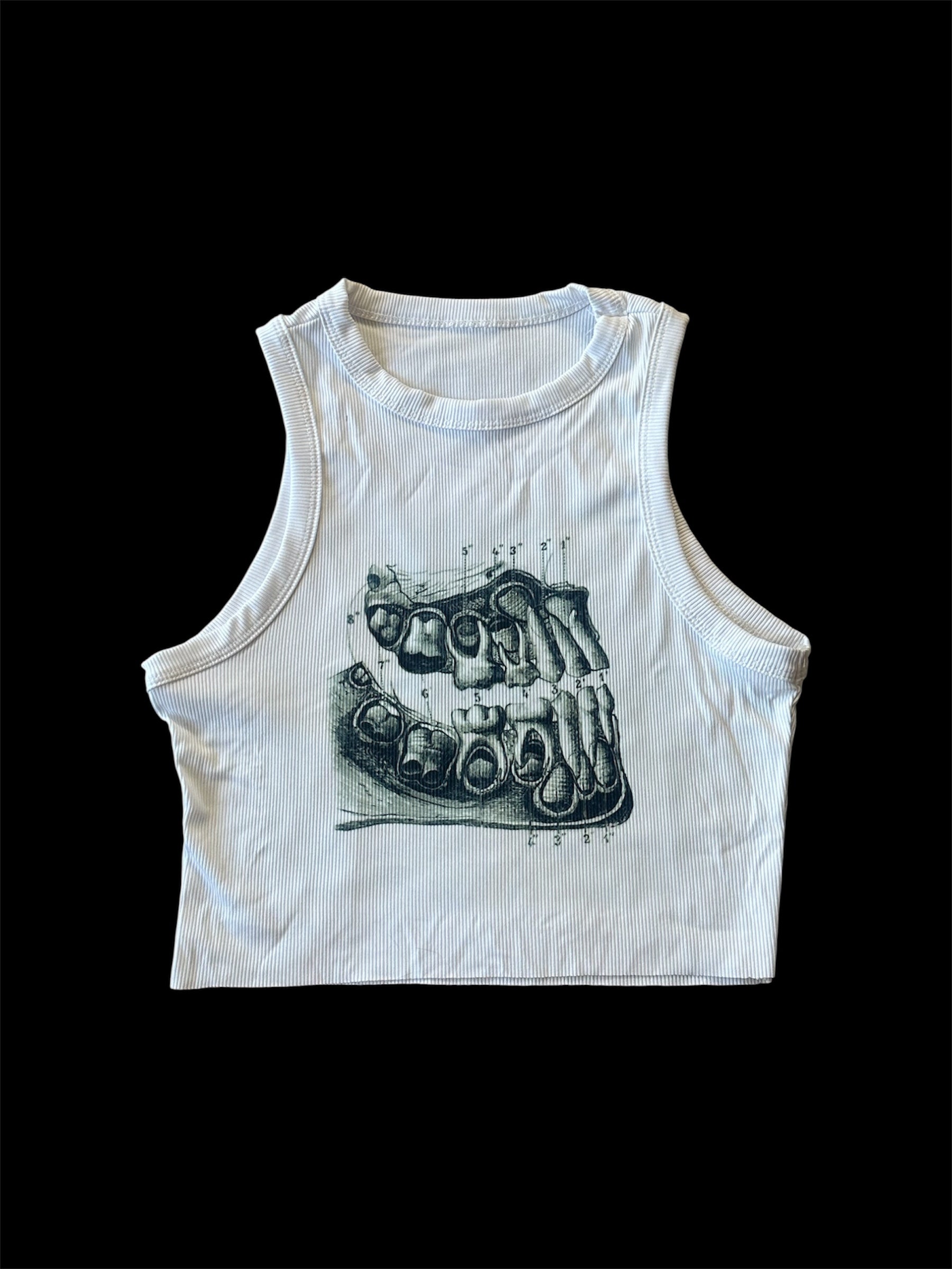 White ribbed cropped tank top with hand printed teeth diagram graphic.