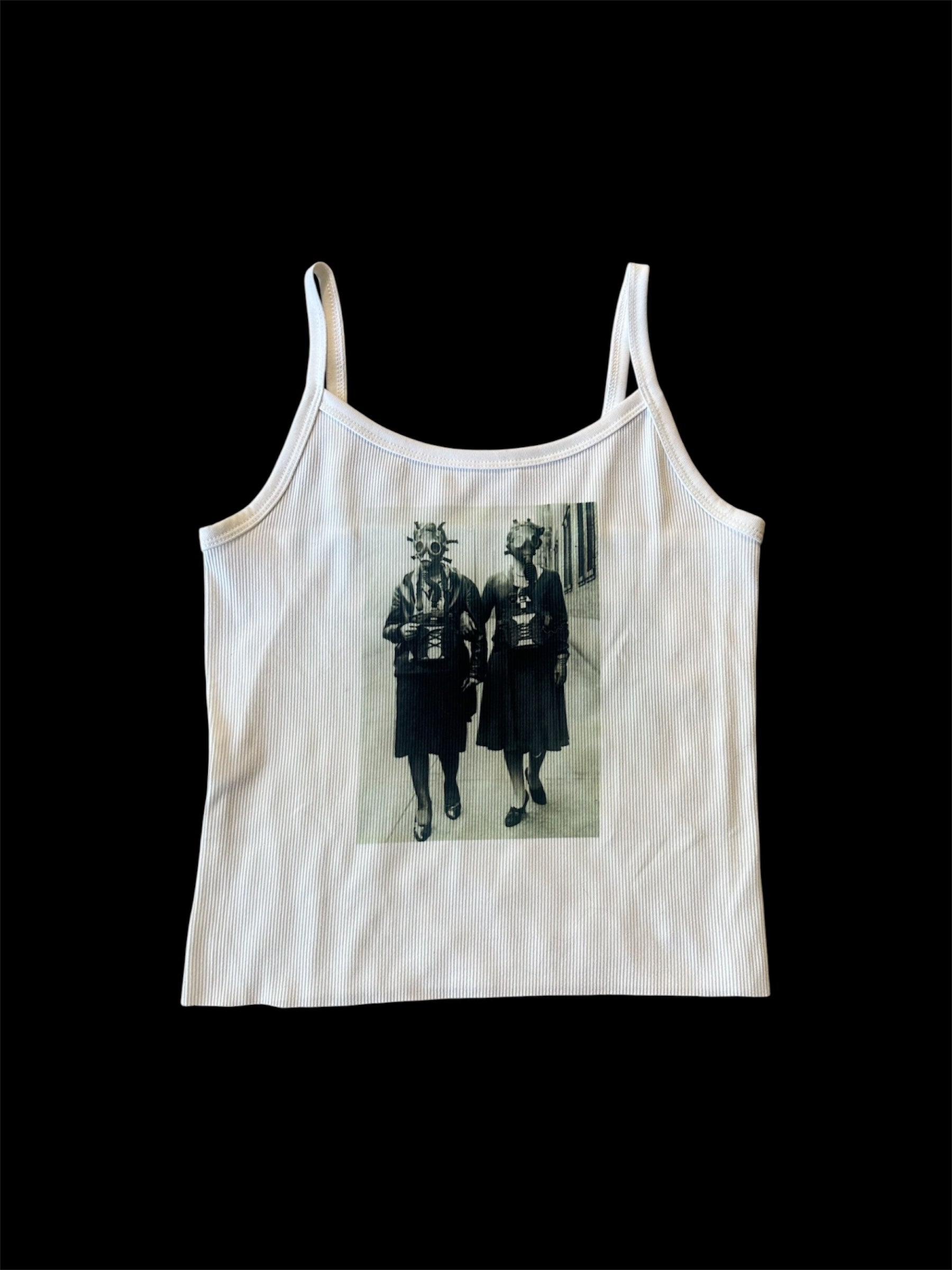 White ribbed cropped tank top with hand printed gas mask couple graphic.