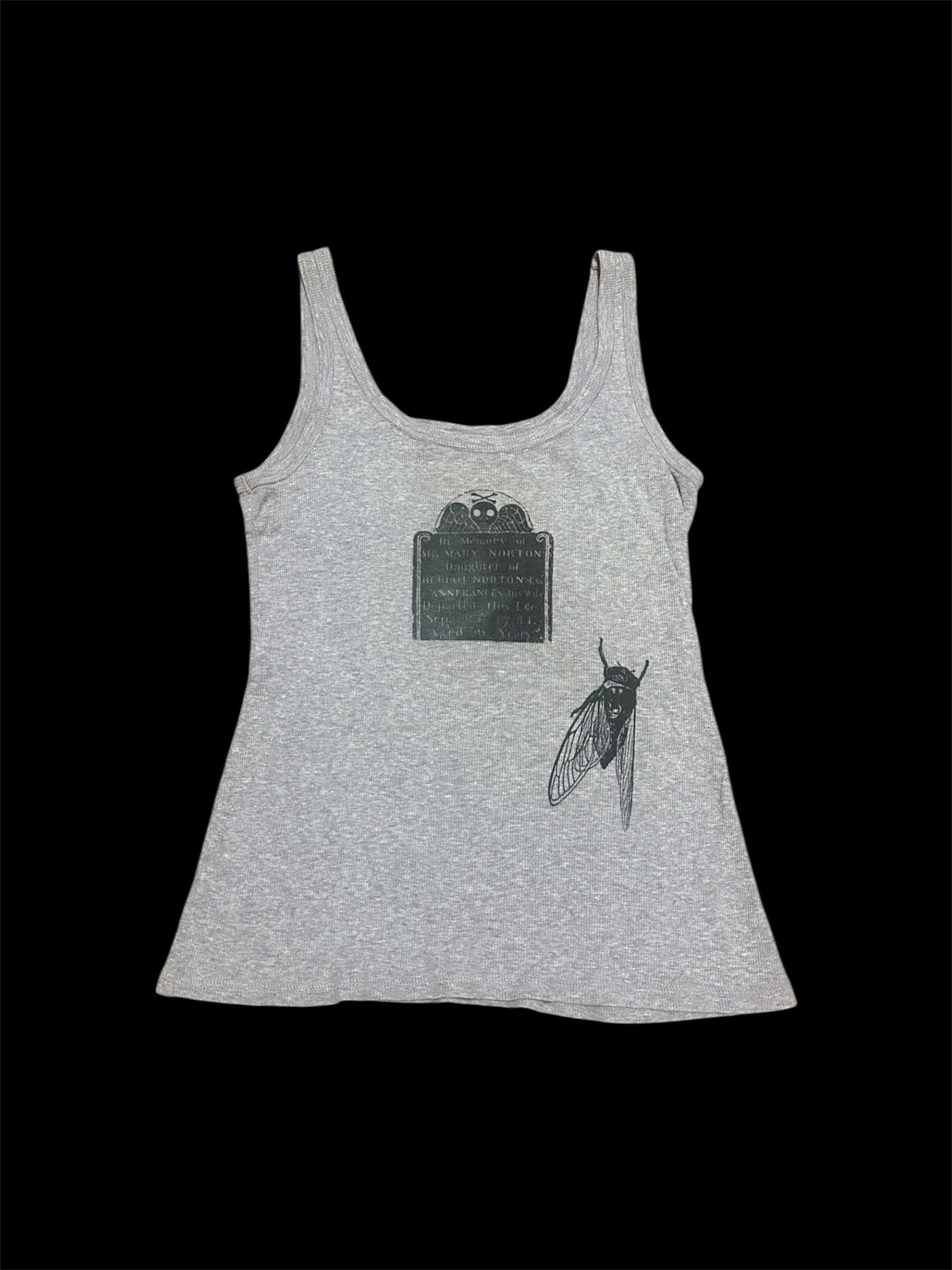 Grey ribbed tank top with a handprinted gravestone and fly graphic.