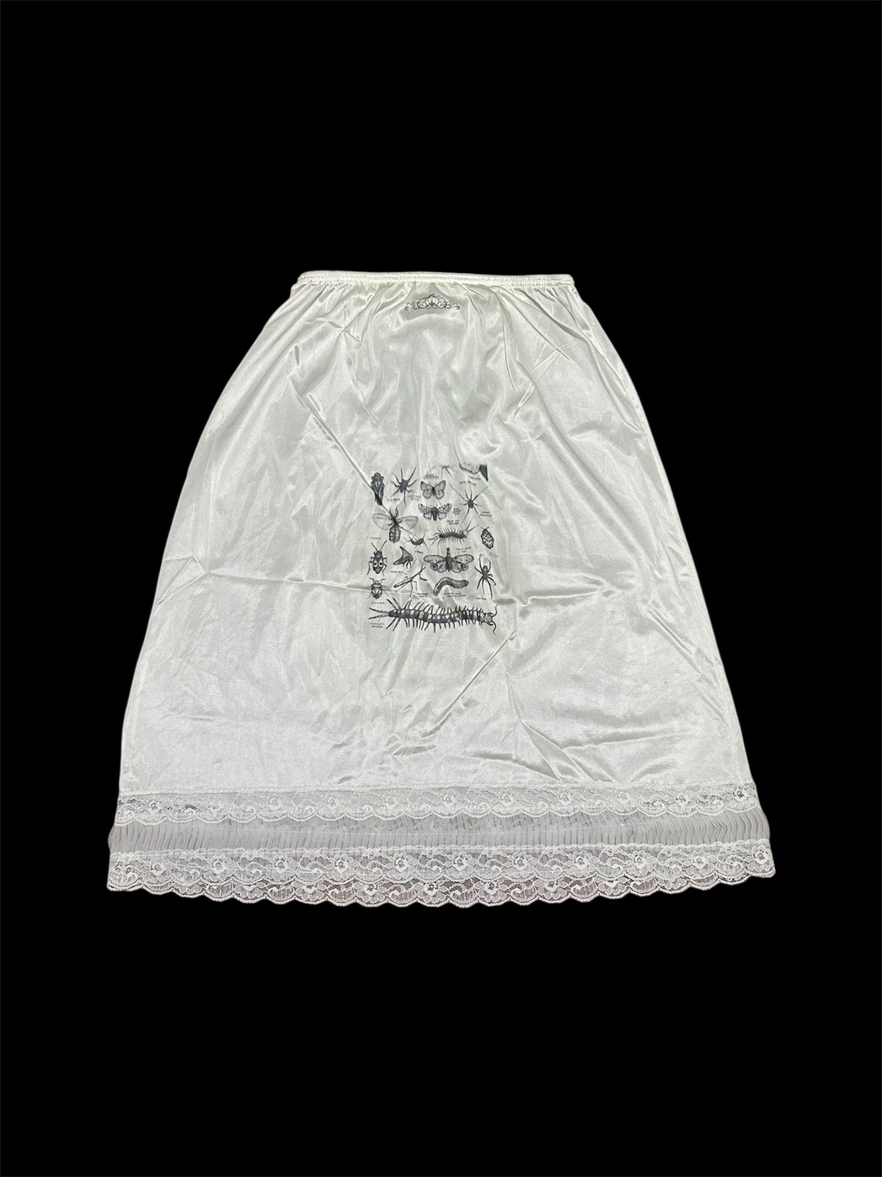 White slip midi skirt with lace trim, stretchy elastic waist, a hand printed ornamental design, and insect graphic.