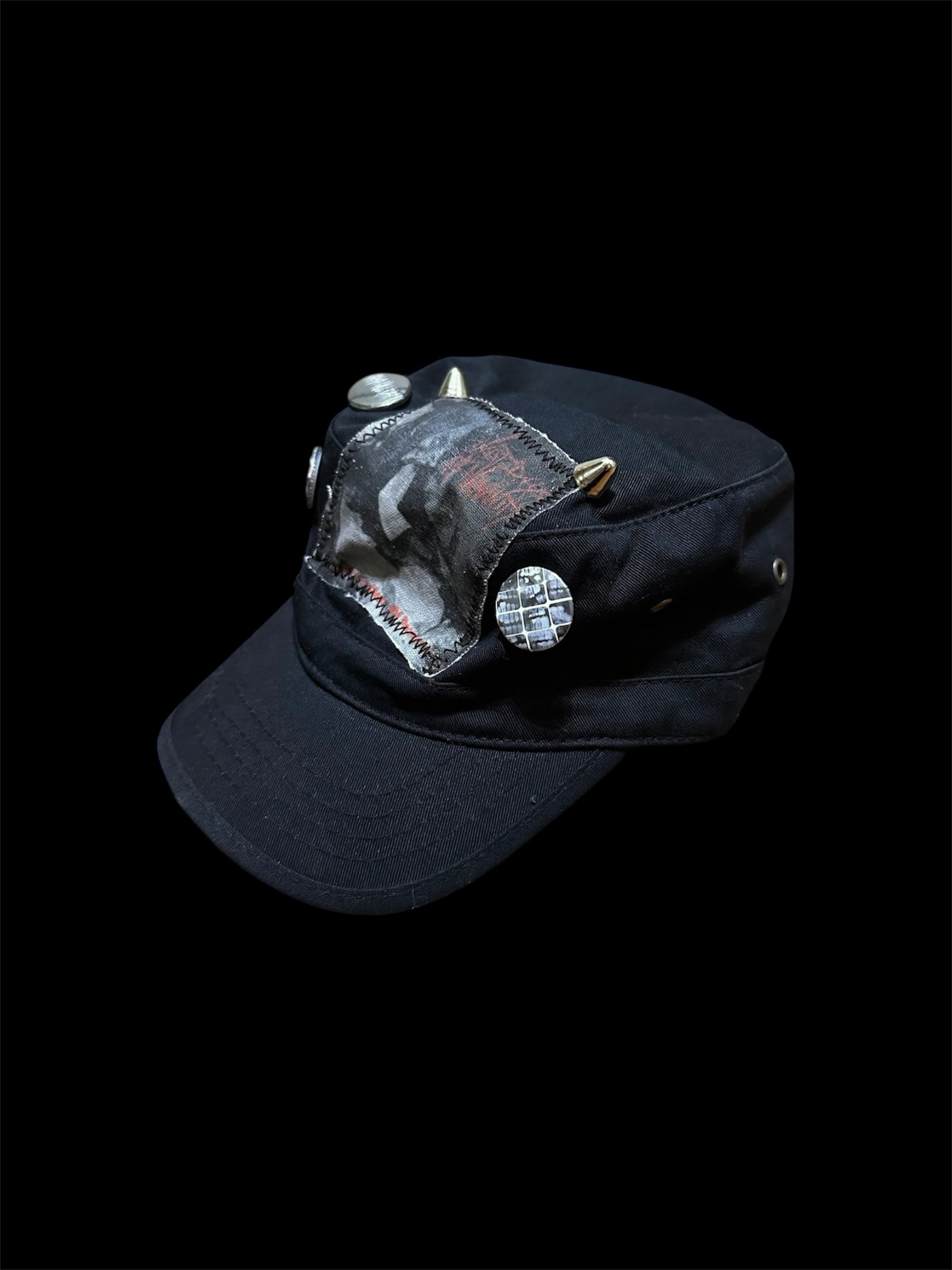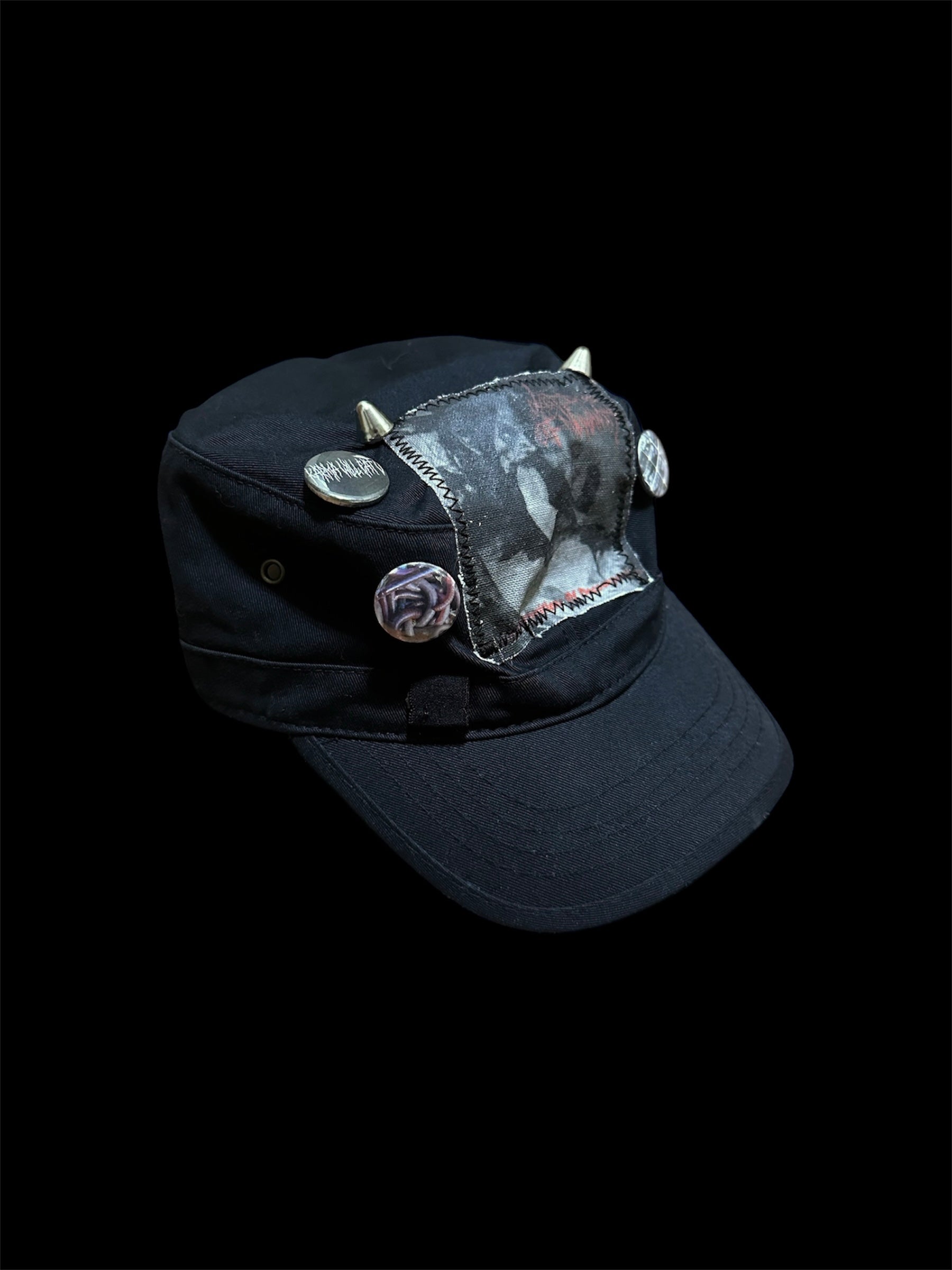 Black hat with three handmade pins, cone studs, and a Last Days of Humanity band patch.