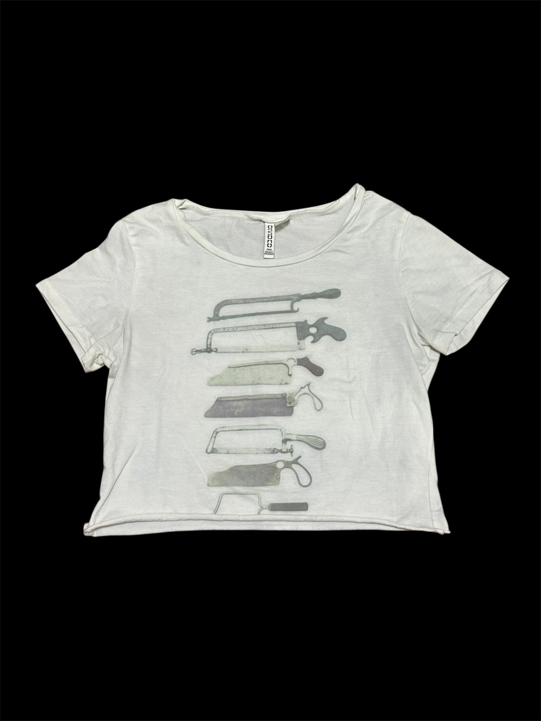 White crop top with a hand printed medical tools graphic.
