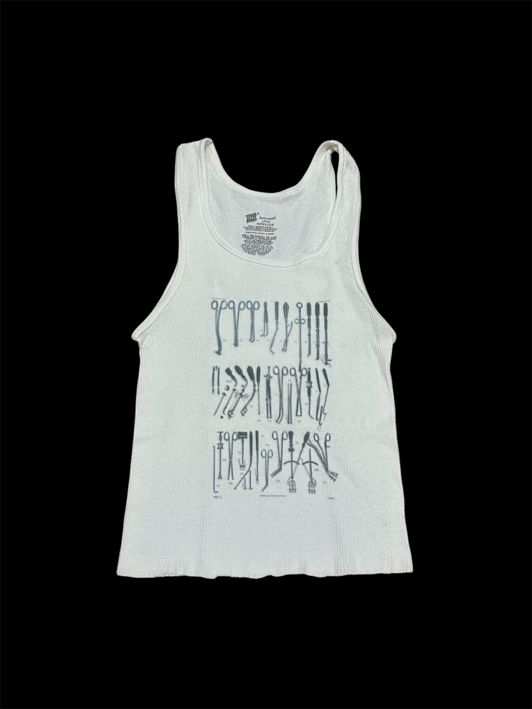 White ribbed cropped tank top with a handprinted medical tools graphic.