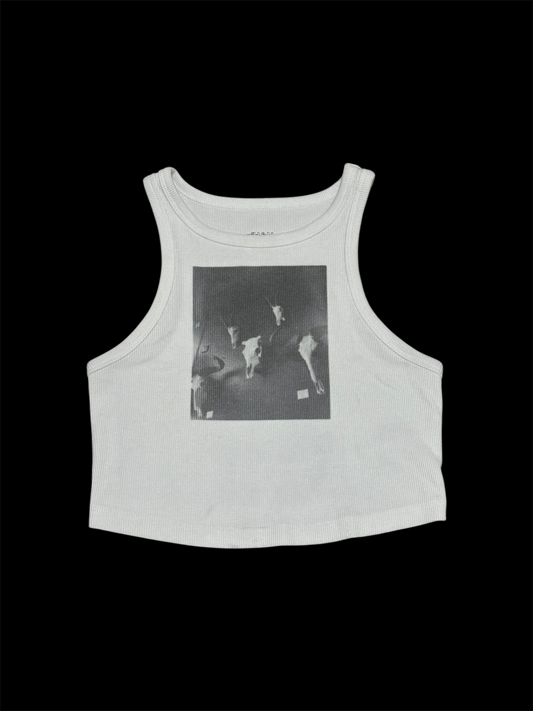 White ribbed cropped tank top with a hand printed taxidermy skull mounts graphic.