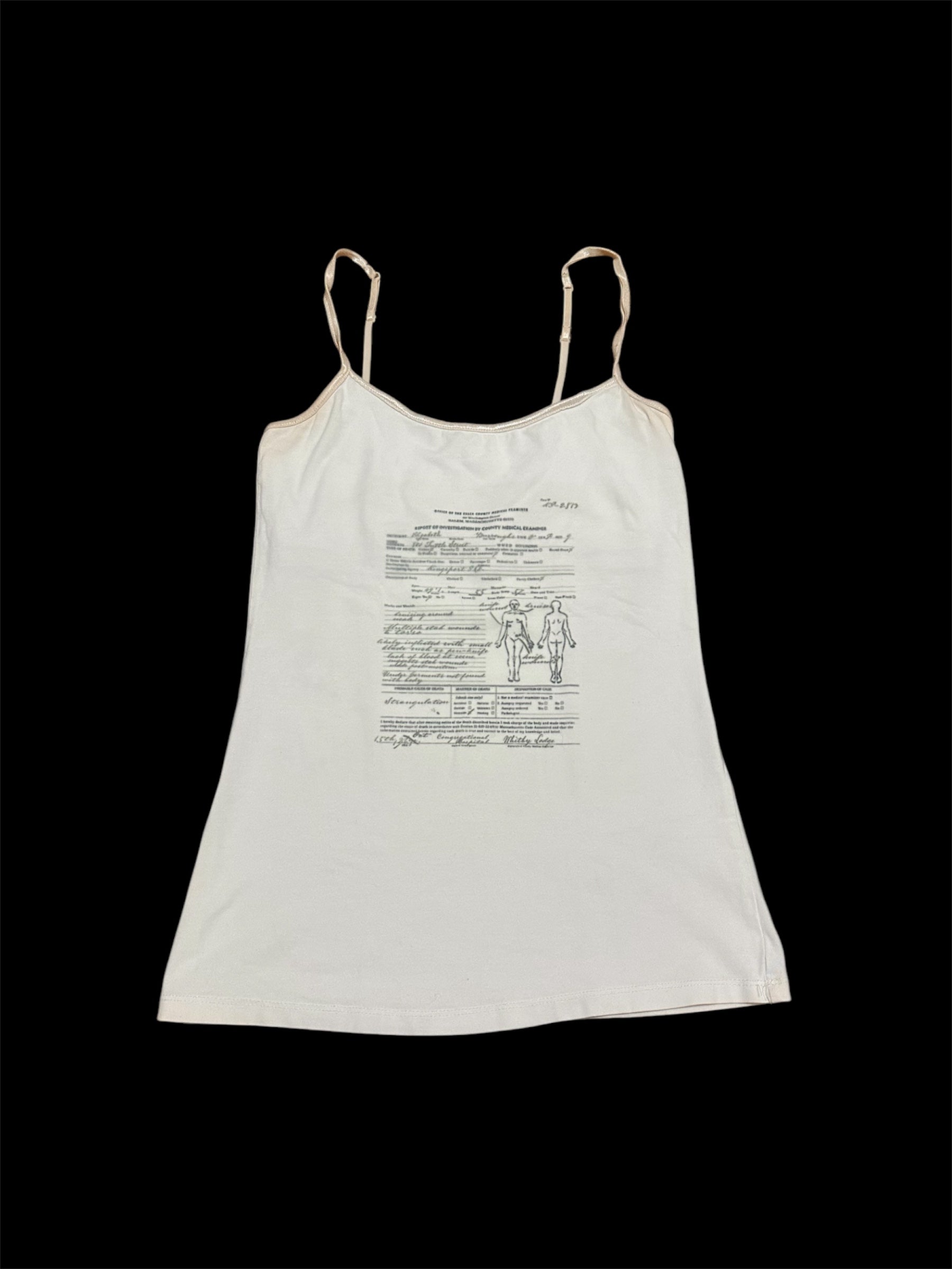 White tank top with adjustable straps and a handprinted investigation report graphic.