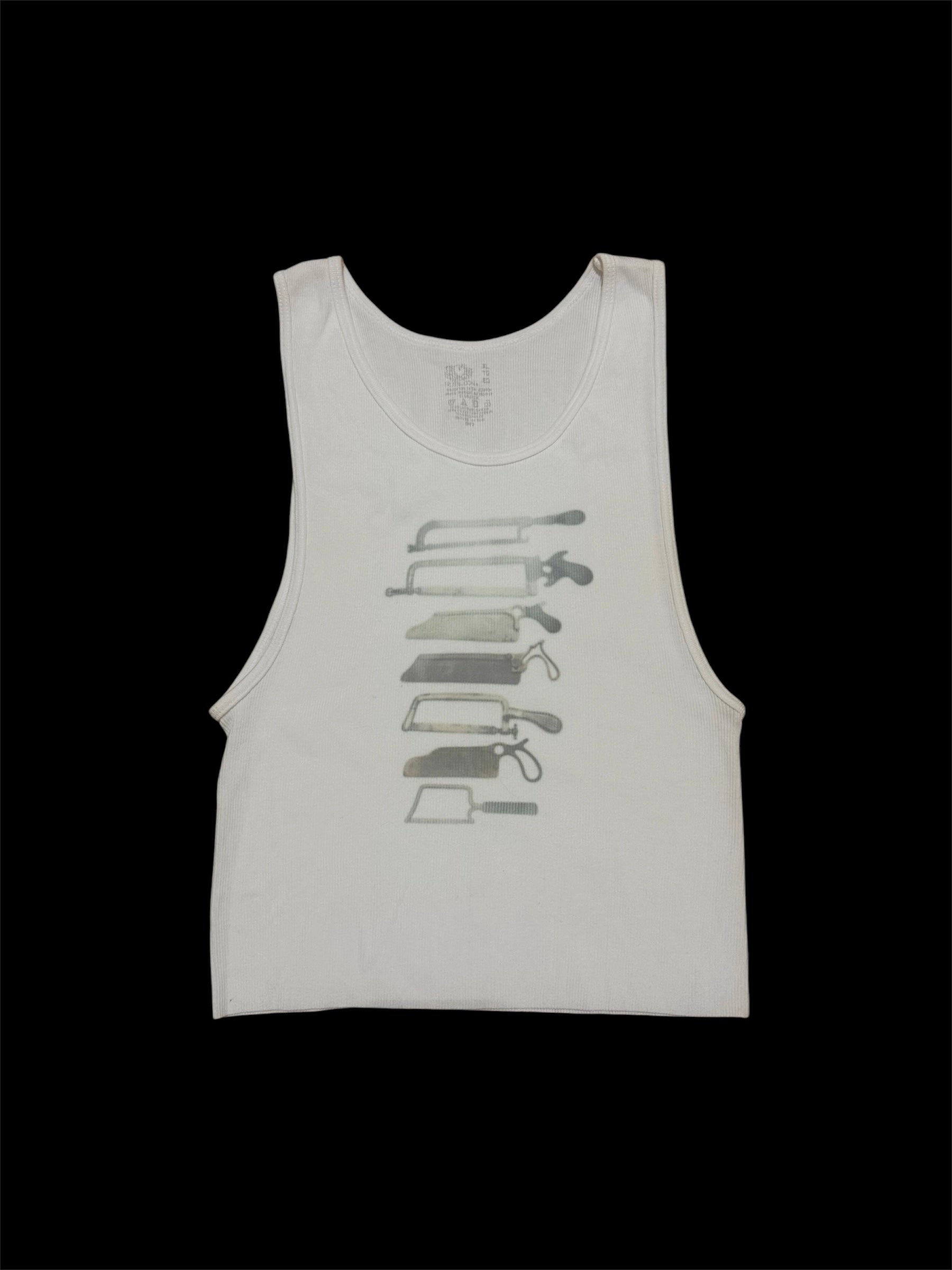 White ribbed cropped tank top with a hand printed medical tools graphic.
