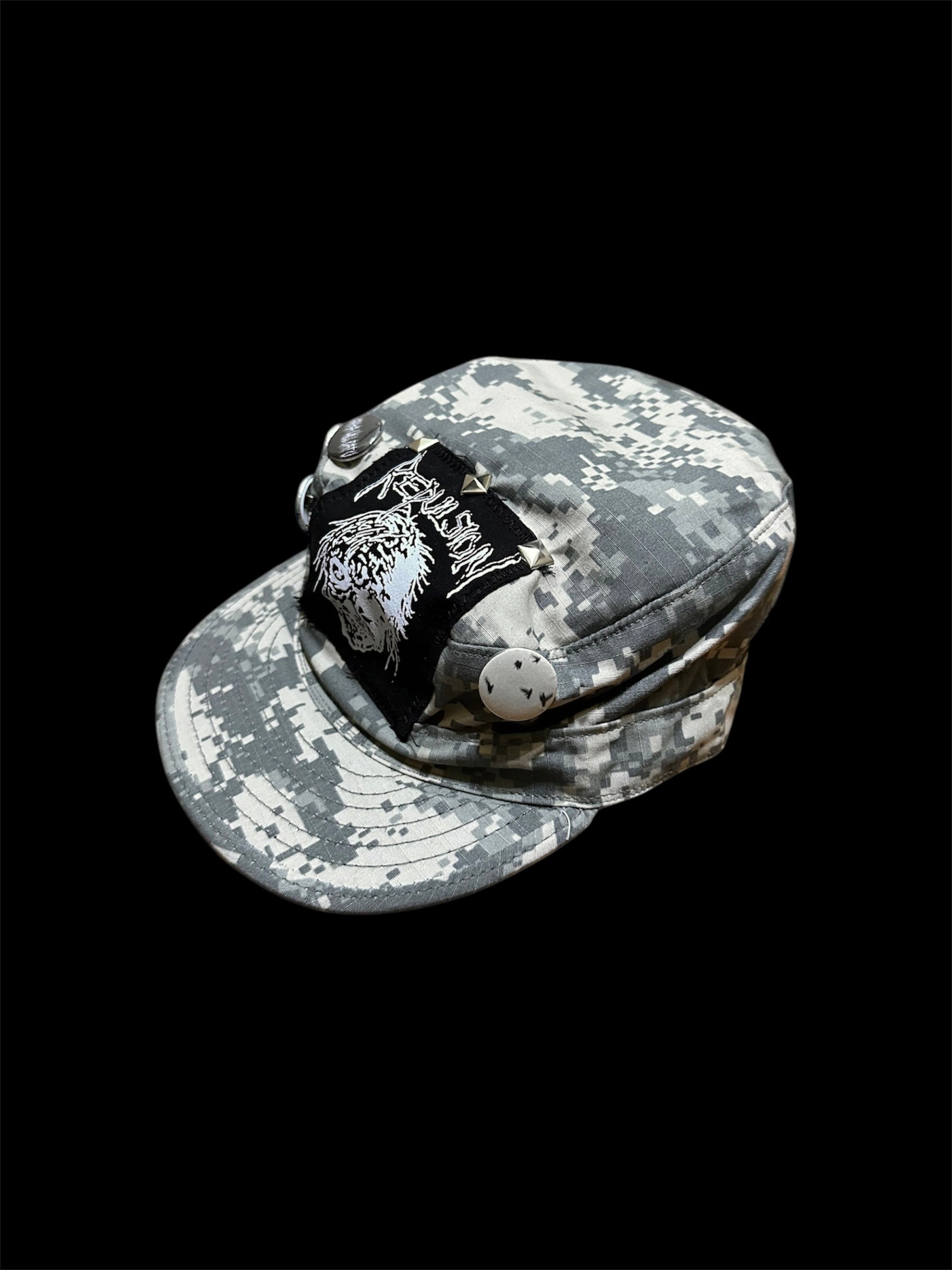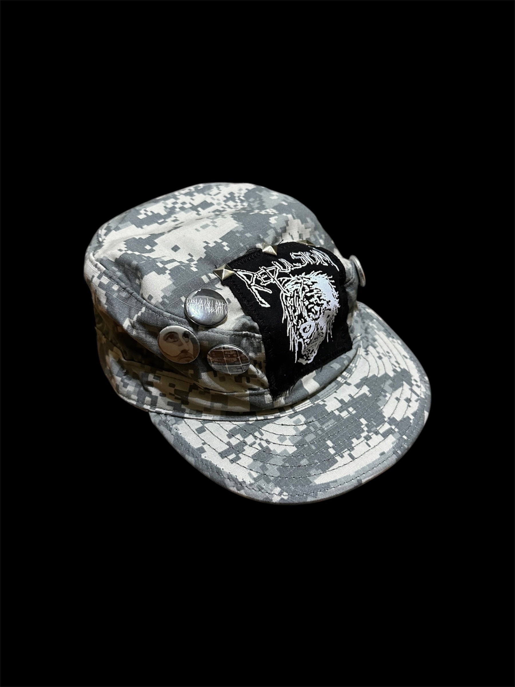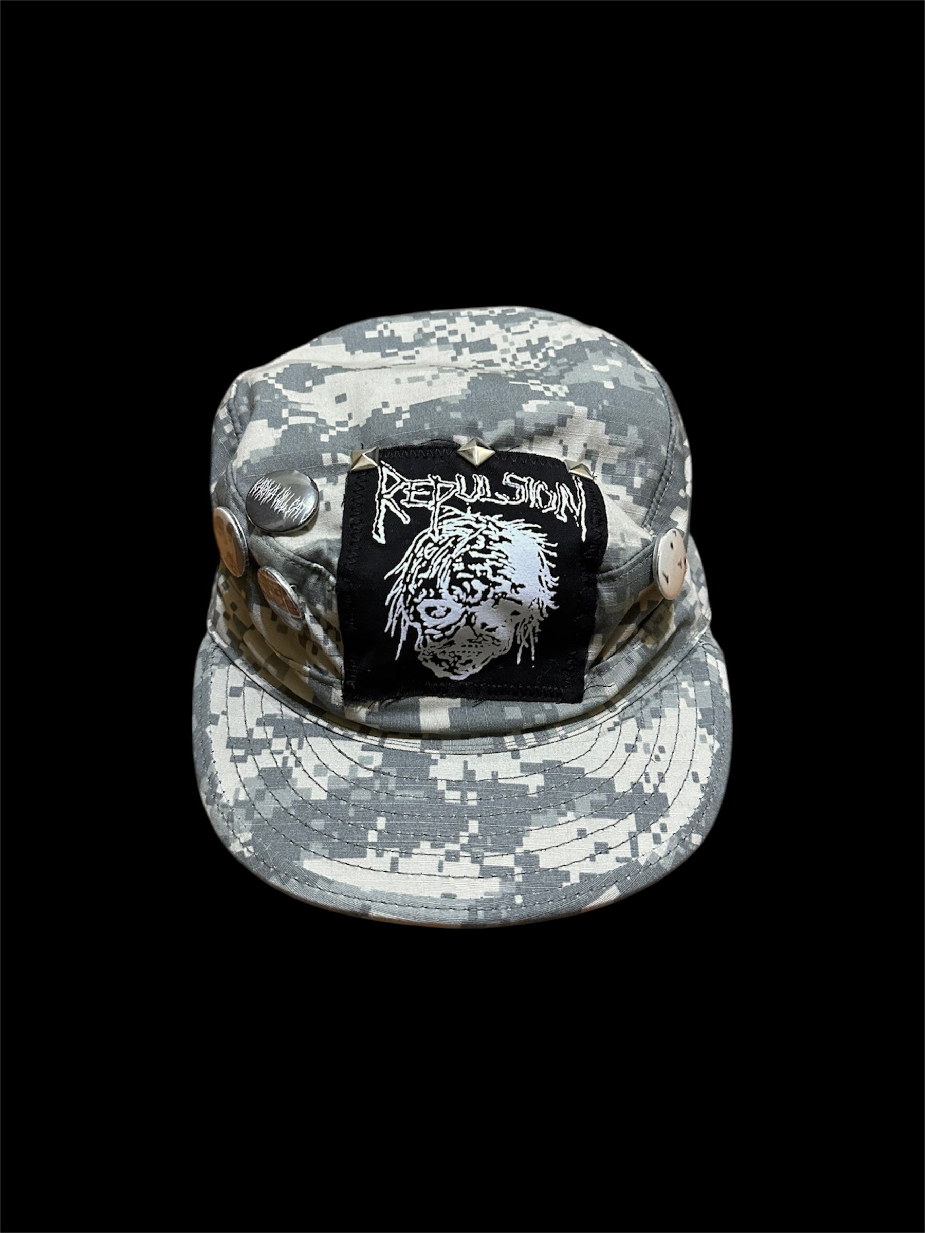 Camo army hat with four handmade pins, square studs, and a Repulsion band patch.