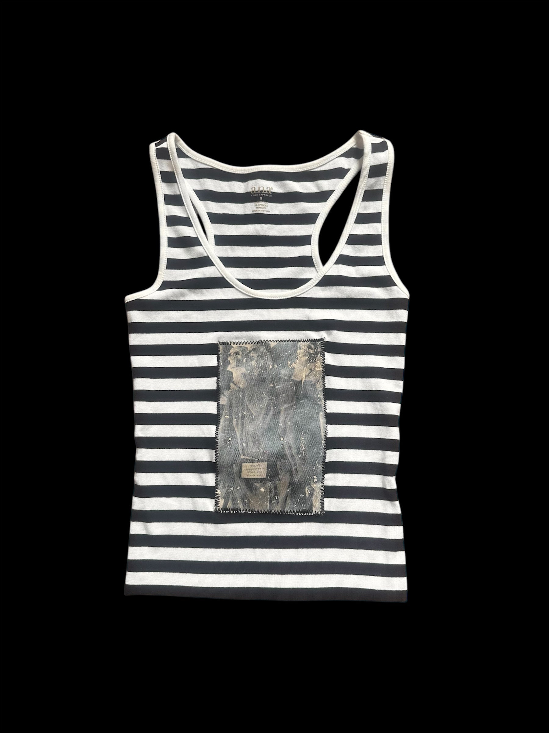 Black and white striped cropped tank top with a handmade patch made from a vintage LIFE magazine photo.