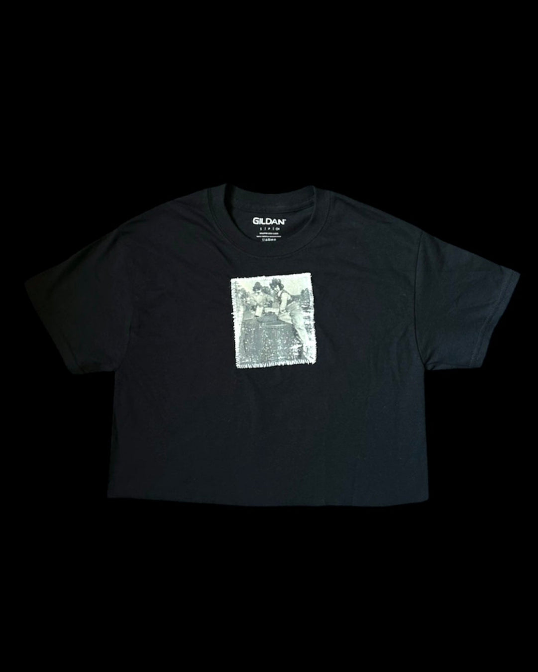 Black 100% cotton crop top with a patch made from a vintage LIFE magazine photo.