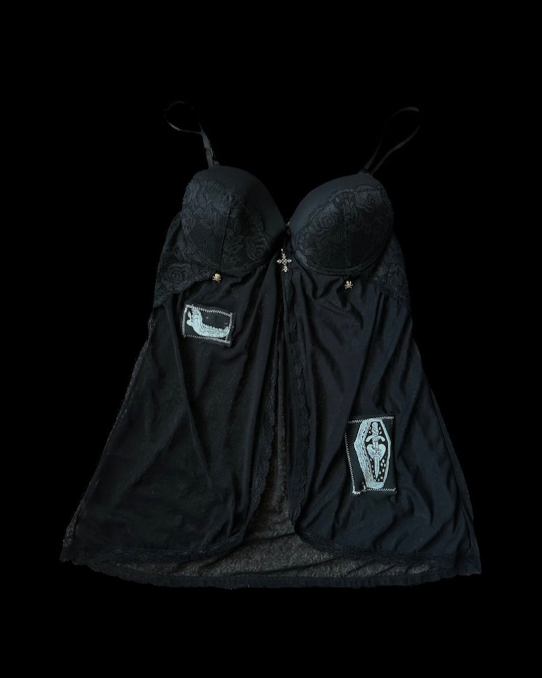Black sheer lace lingerie top with adjustable straps, two handmade linocut patches, a cross pendant, and two skull studs.