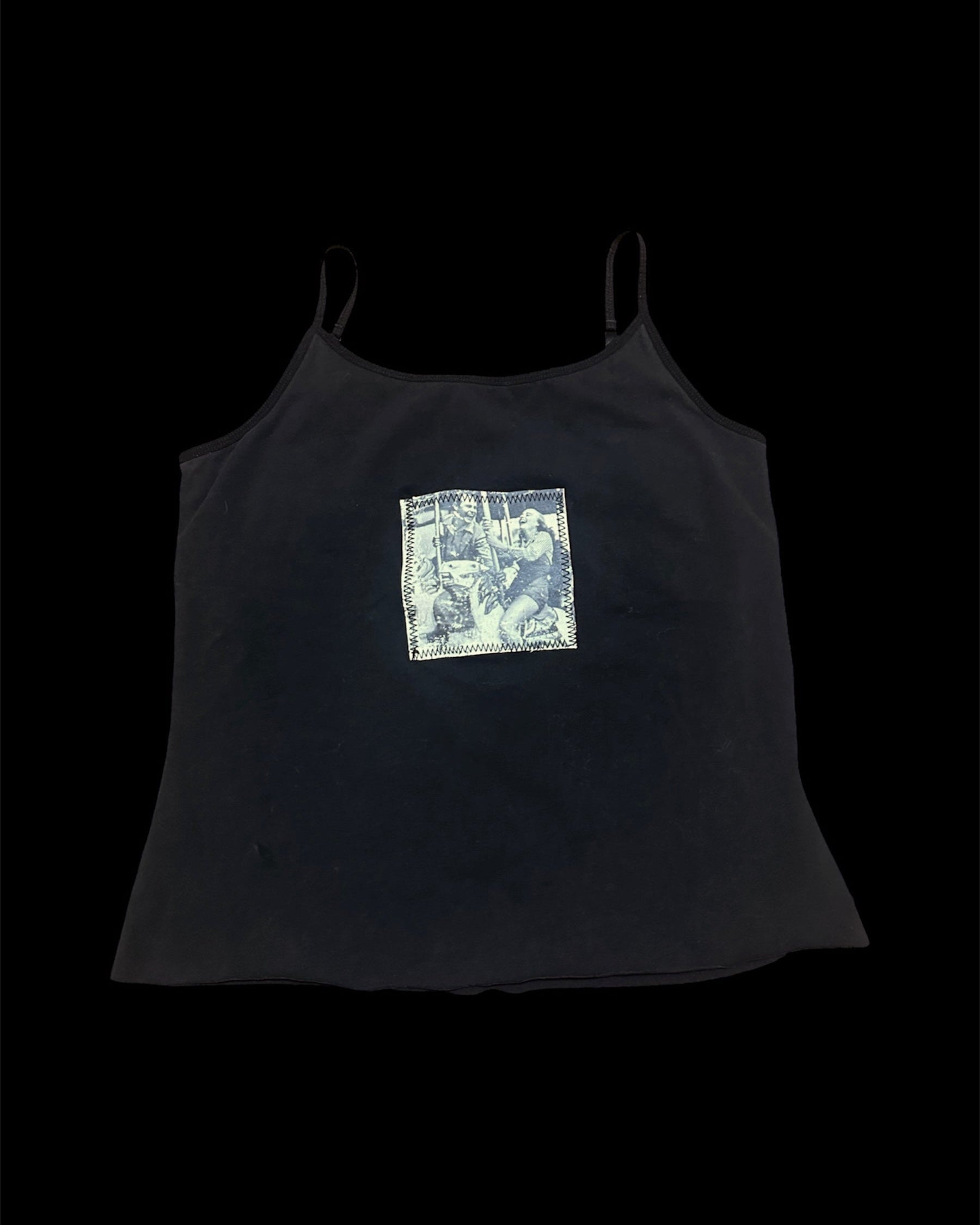Black cropped tank top with adjustable straps, and a handmade patch made from a vintage LIFE magazine photo.