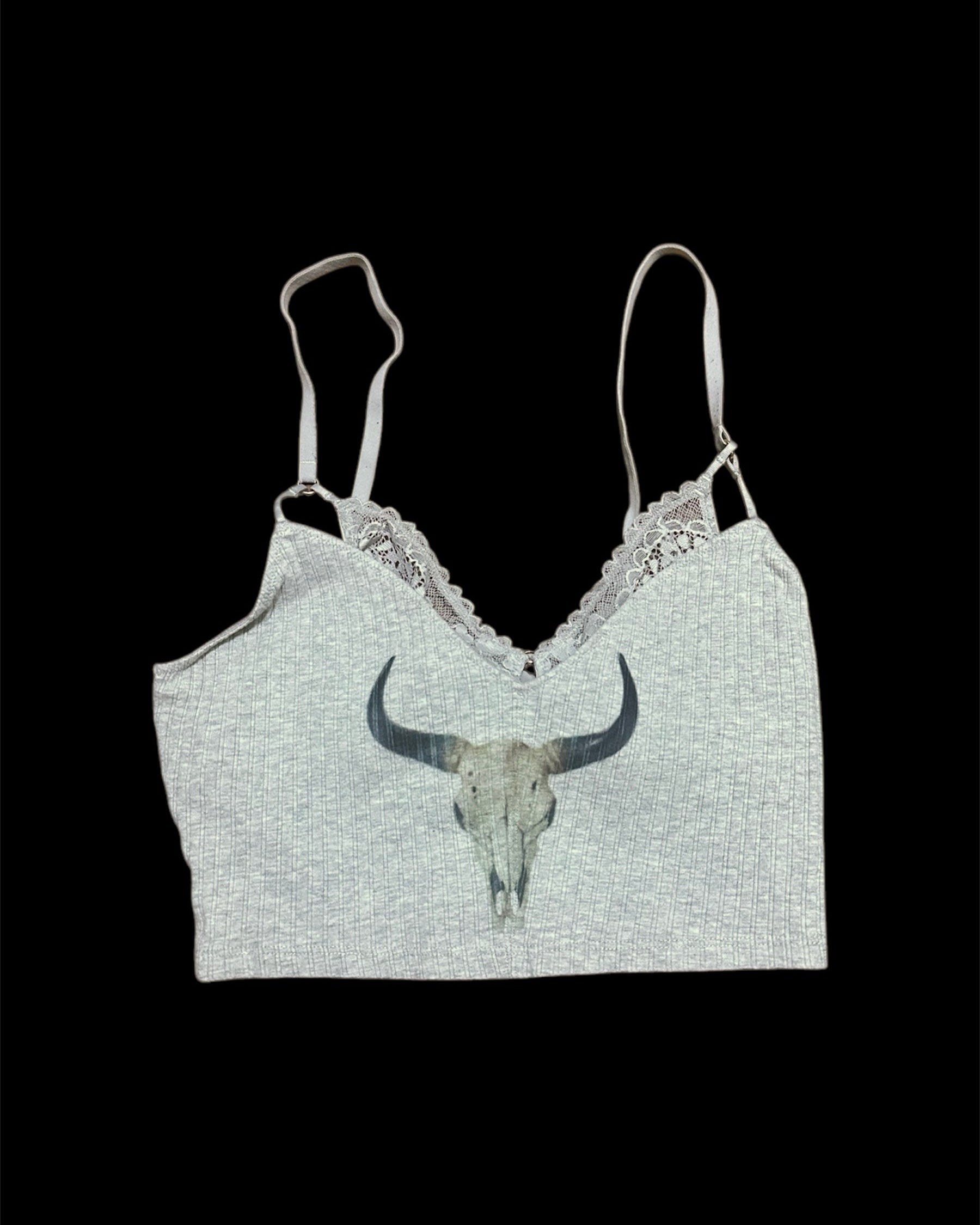 Grey ribbed cropped tank top with built in lace bralette, adjustable straps, and a hand printed cow skull graphic.