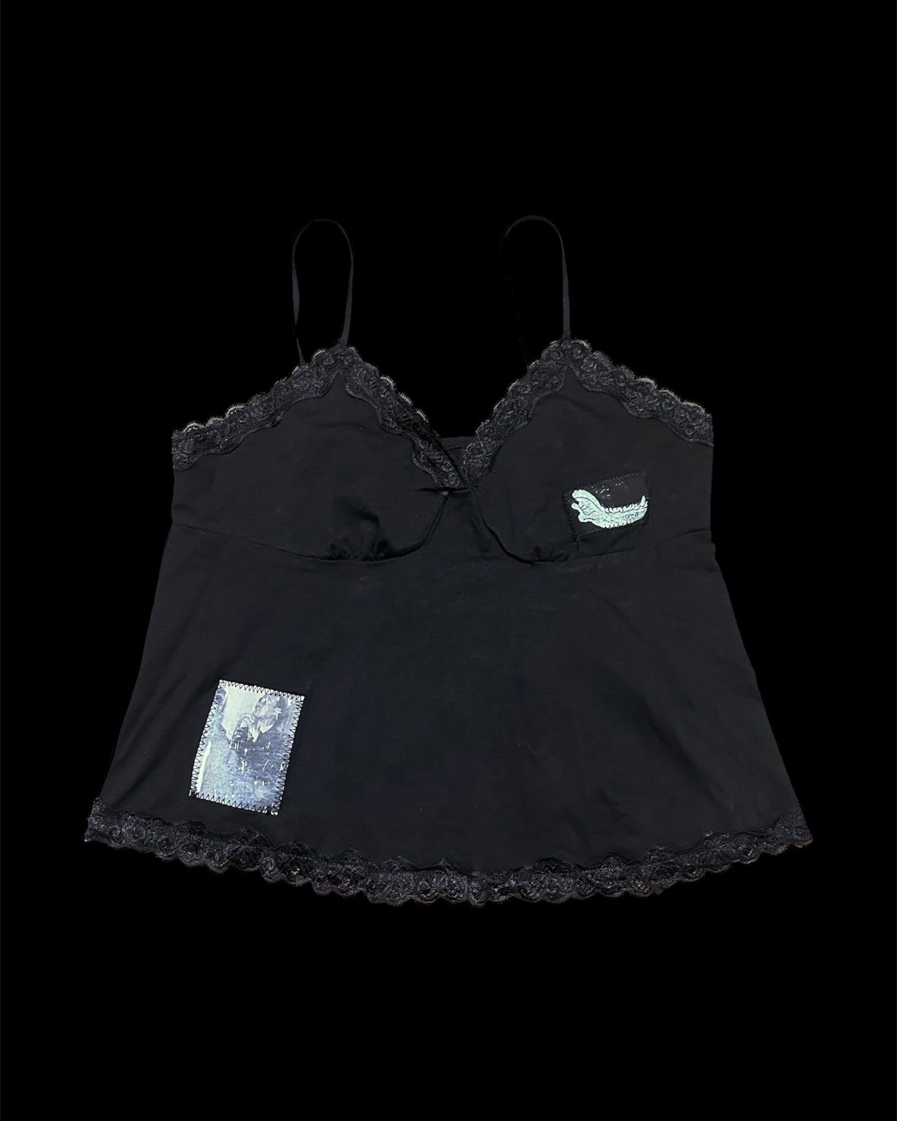 Black cropped tank top with lace trim and one handmade patch made from a vintage LIFE magazine photo and a hand carved linocut patch.