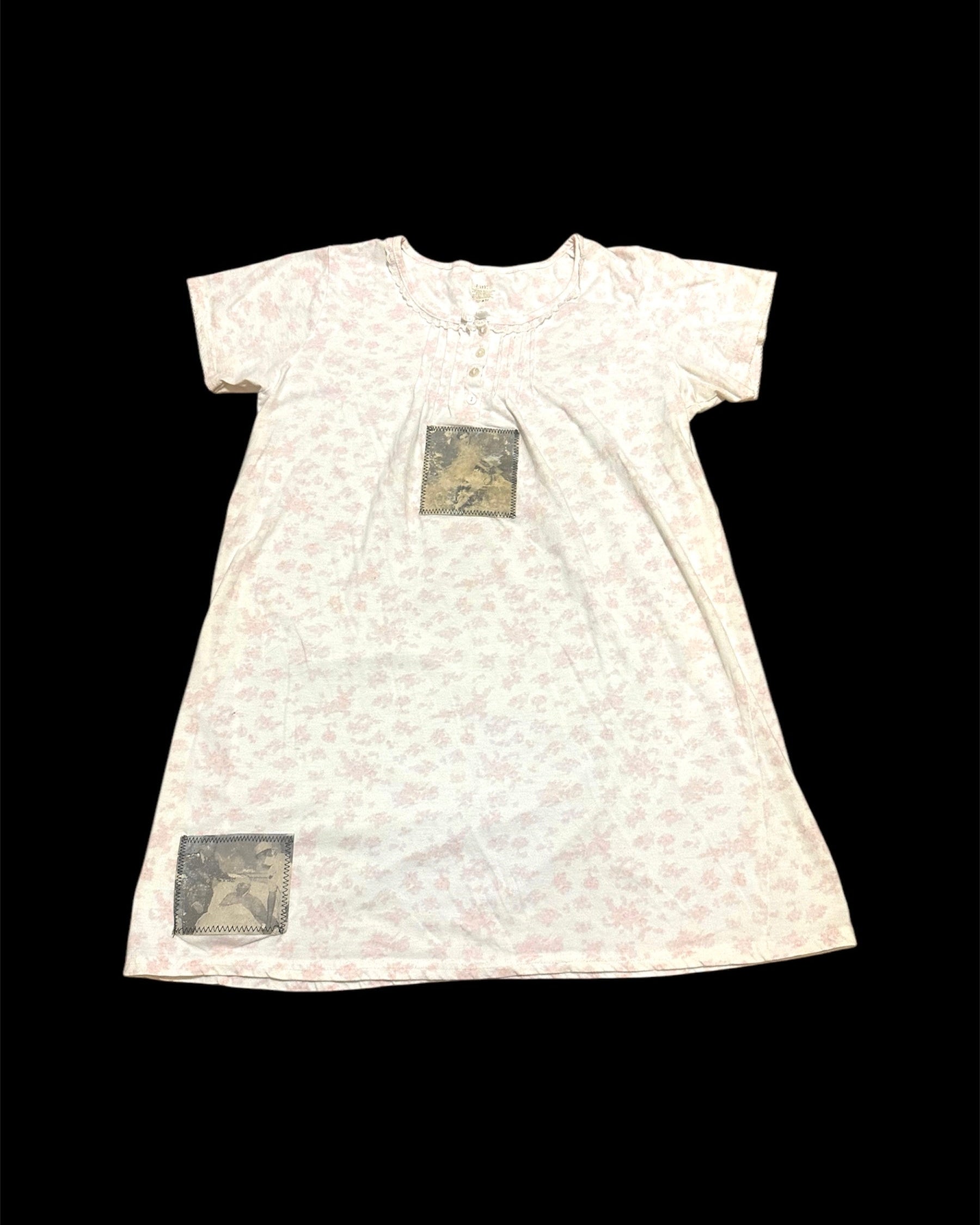 Pink and white floral nightgown with lace details, buttons, a bow, and two handmade patches made from vintage LIFE magazine photos.