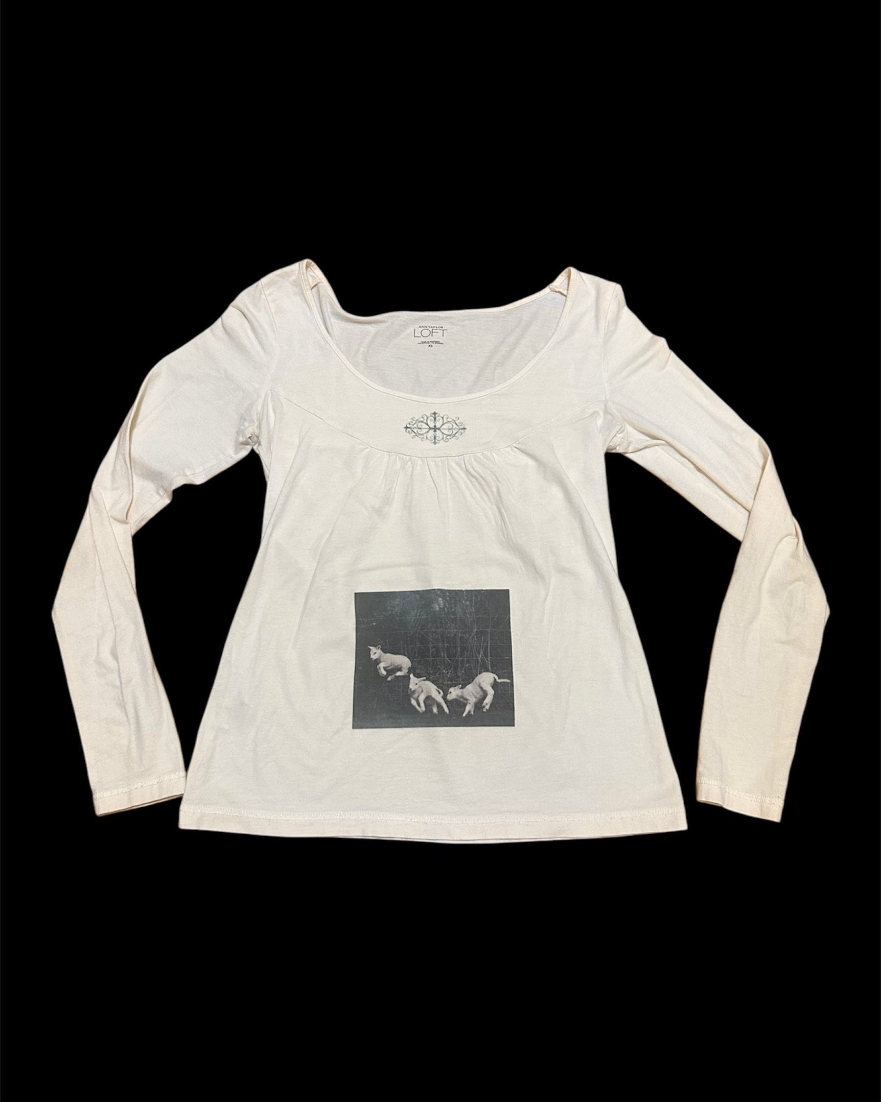 White long sleeve with a handprinted lamb, and ornamental design graphic.