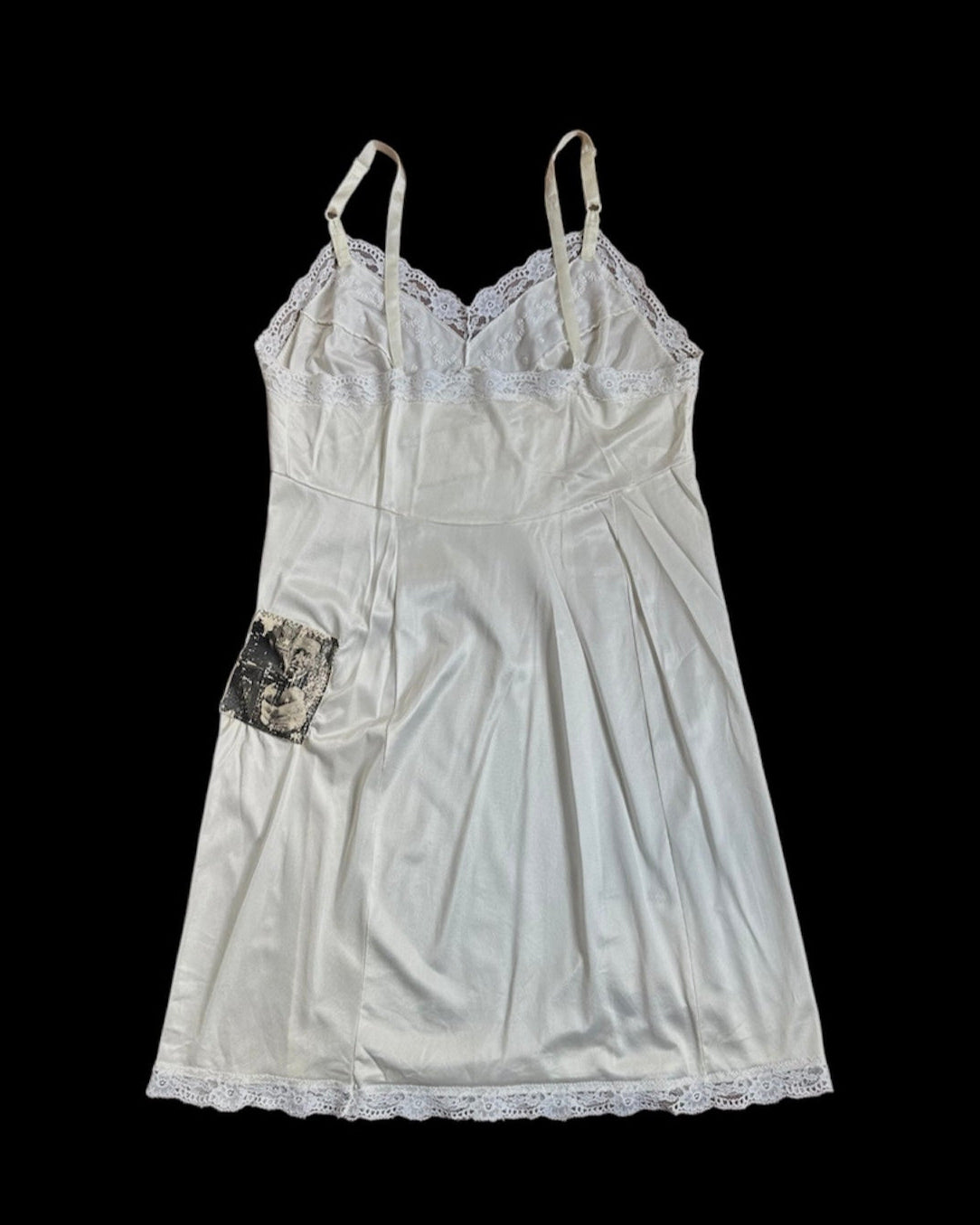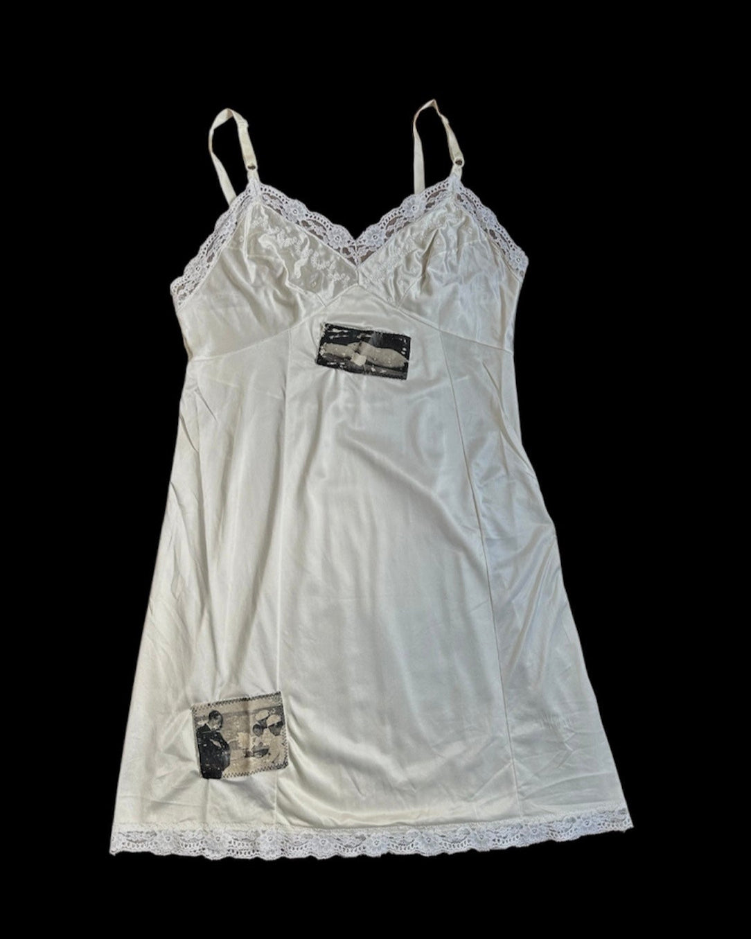 White slip dress with adjustable straps, lace trim, and three patches made from vintage LIFE magazine photos.
