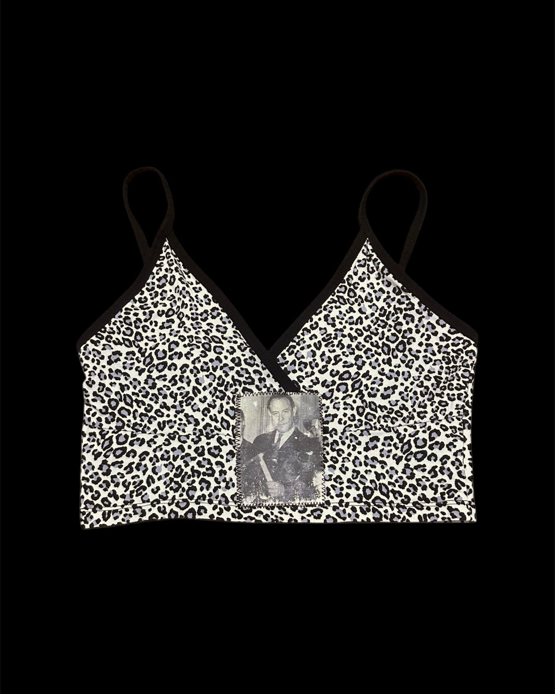 Black and white cheetah/leopard print cropped tank top with a handmade patch made from a vintage LIFE magazine photo.