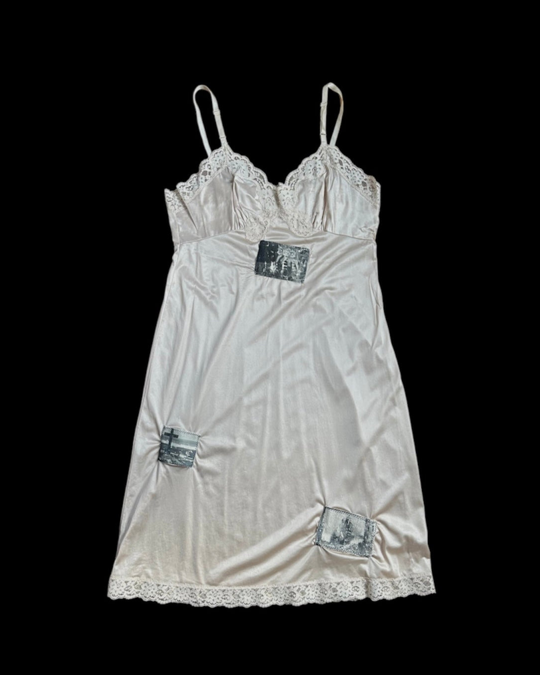 Cream slip dress with adjustable straps, lace trim, and three patches made from vintage LIFE magazine photos.