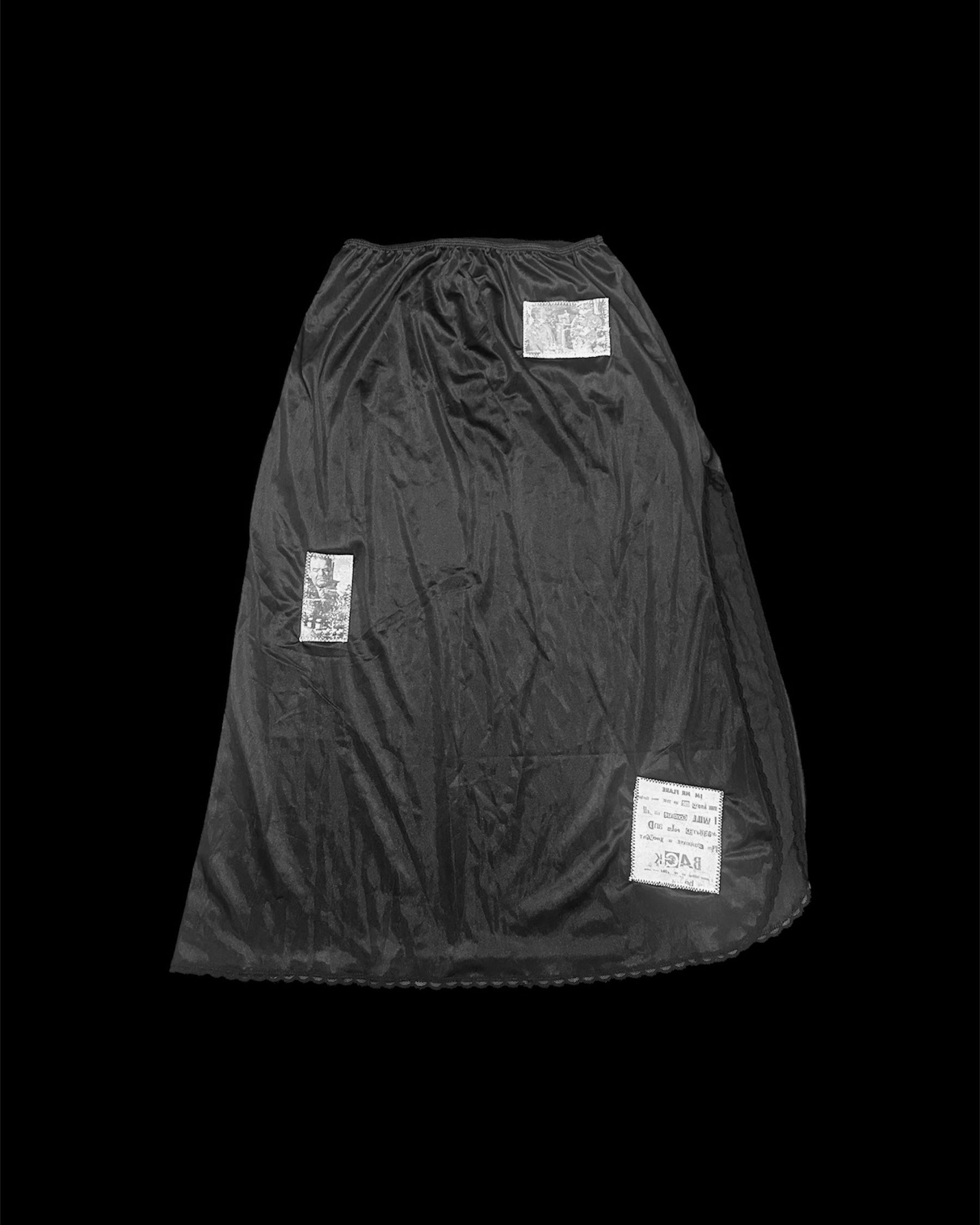 Black lace slip maxi skirt with a stretchy elastic waist, leg slit, and three handmade patches made from vintage LIFE magazine photos.