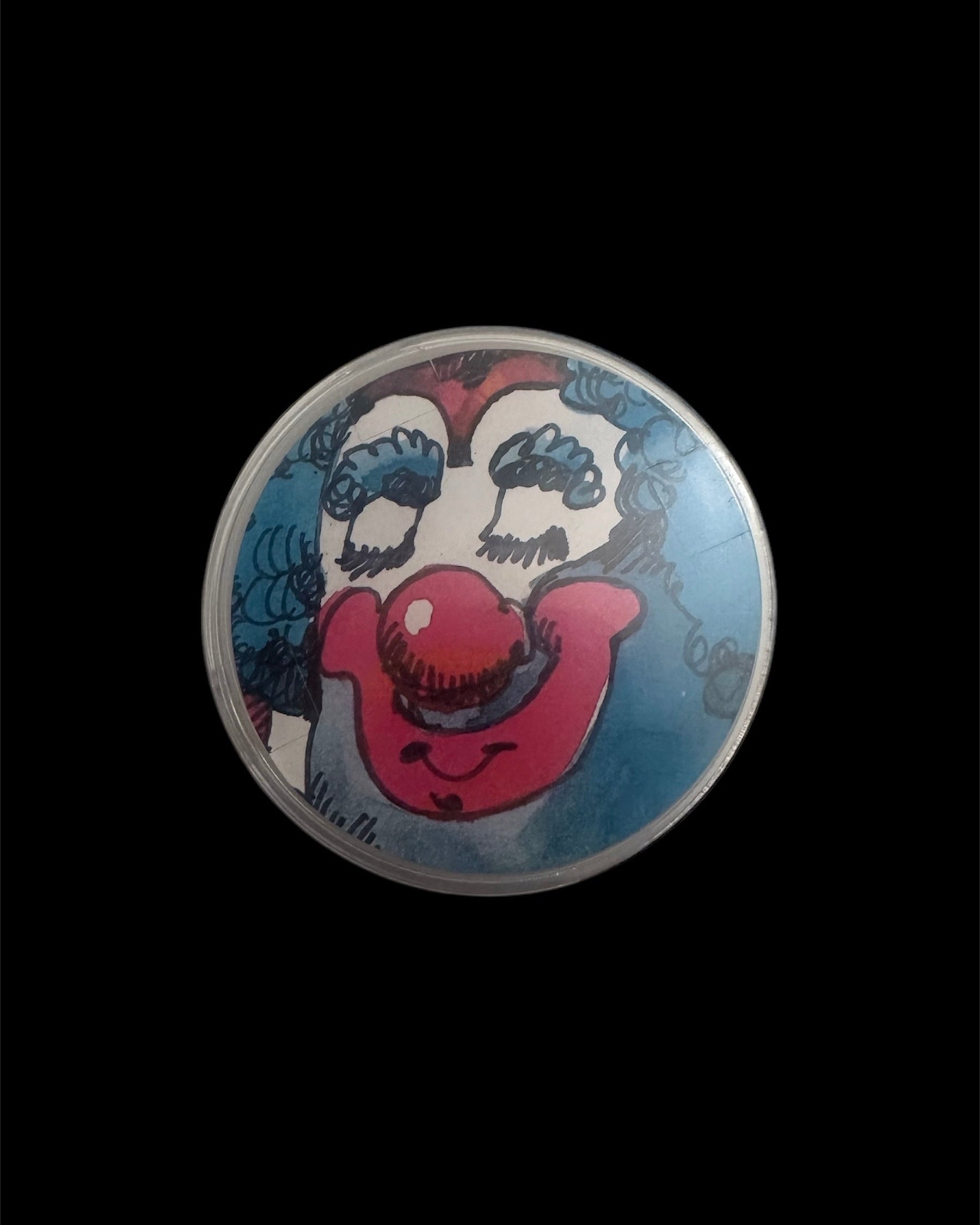 2.25" pin featuring a pink and blue clown from a vintage children's book.