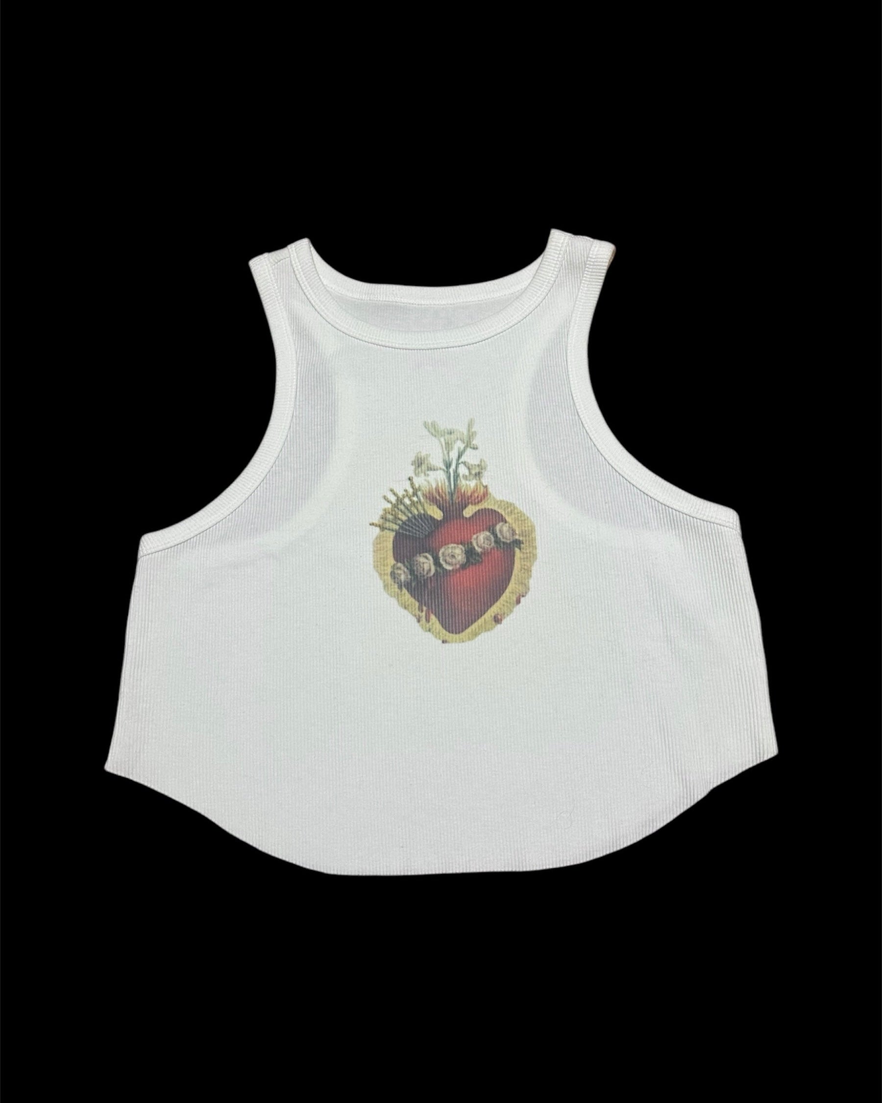 White ribbed cropped tank top with a hand printed scared heart graphic.