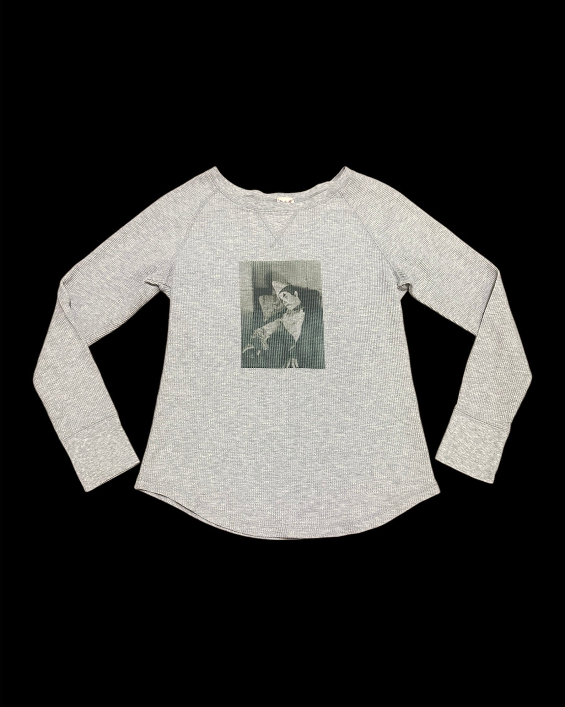 Grey waffle long sleeve with hand printed sad clown graphic.