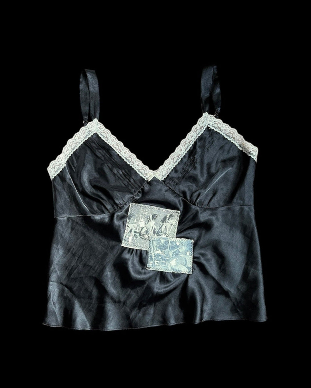 Black slip tank top with adjustable straps, white lace trim, and two patches made from vintage LIFE magazine photos.