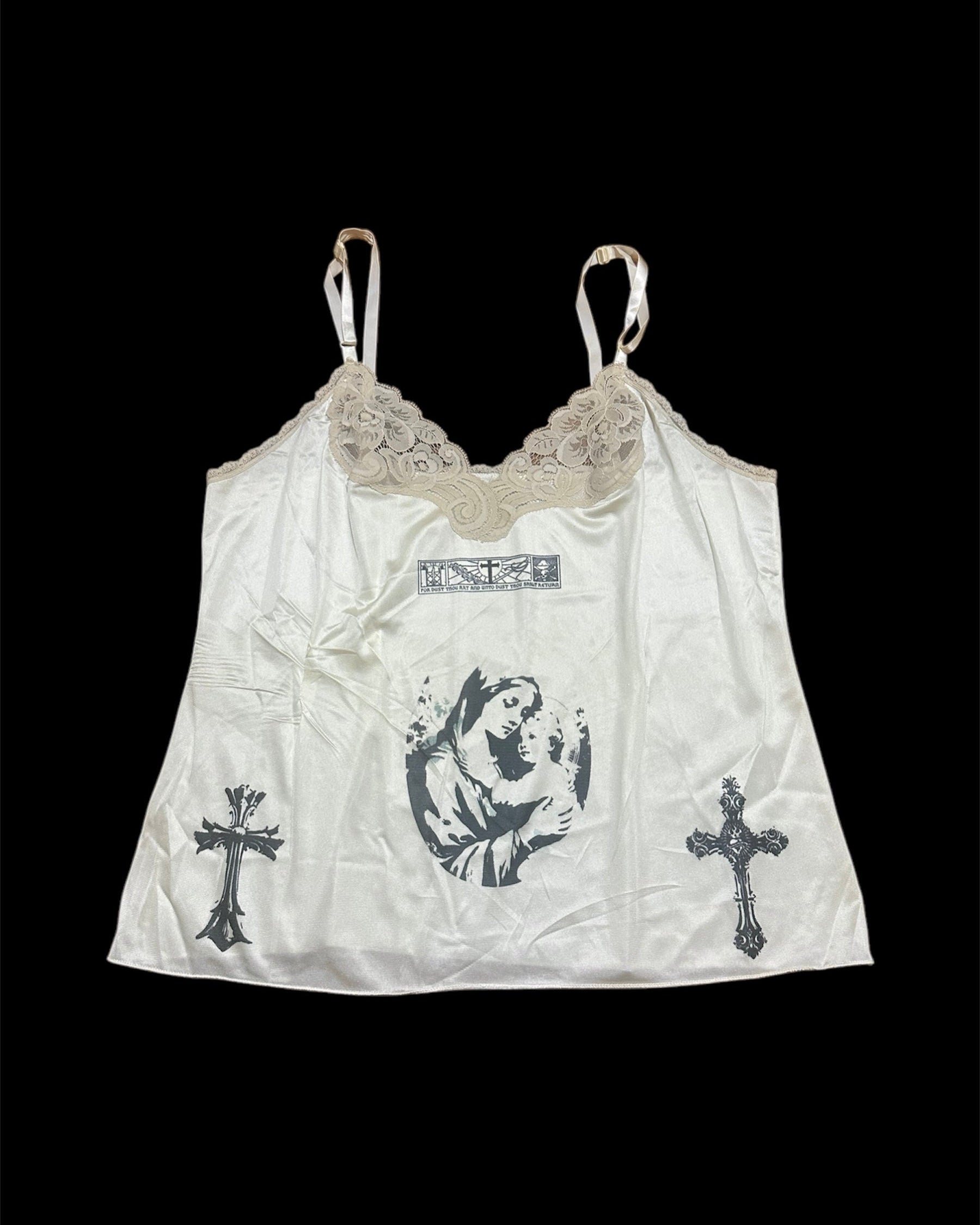 White lace slip tank top with lace trim, adjustable straps, and a hand printed graphic featuring Virgin Mary, baby jesus, and crosses.