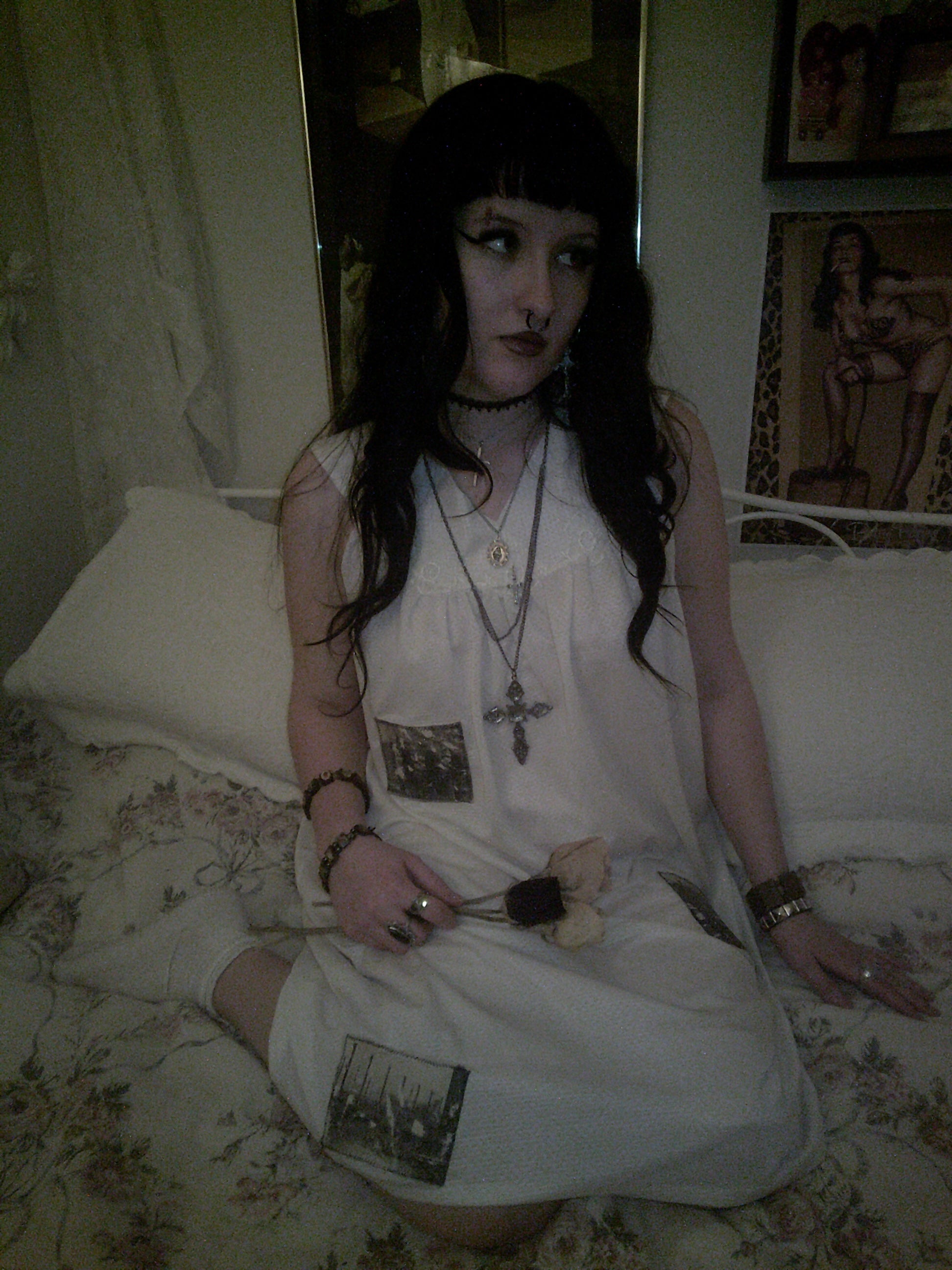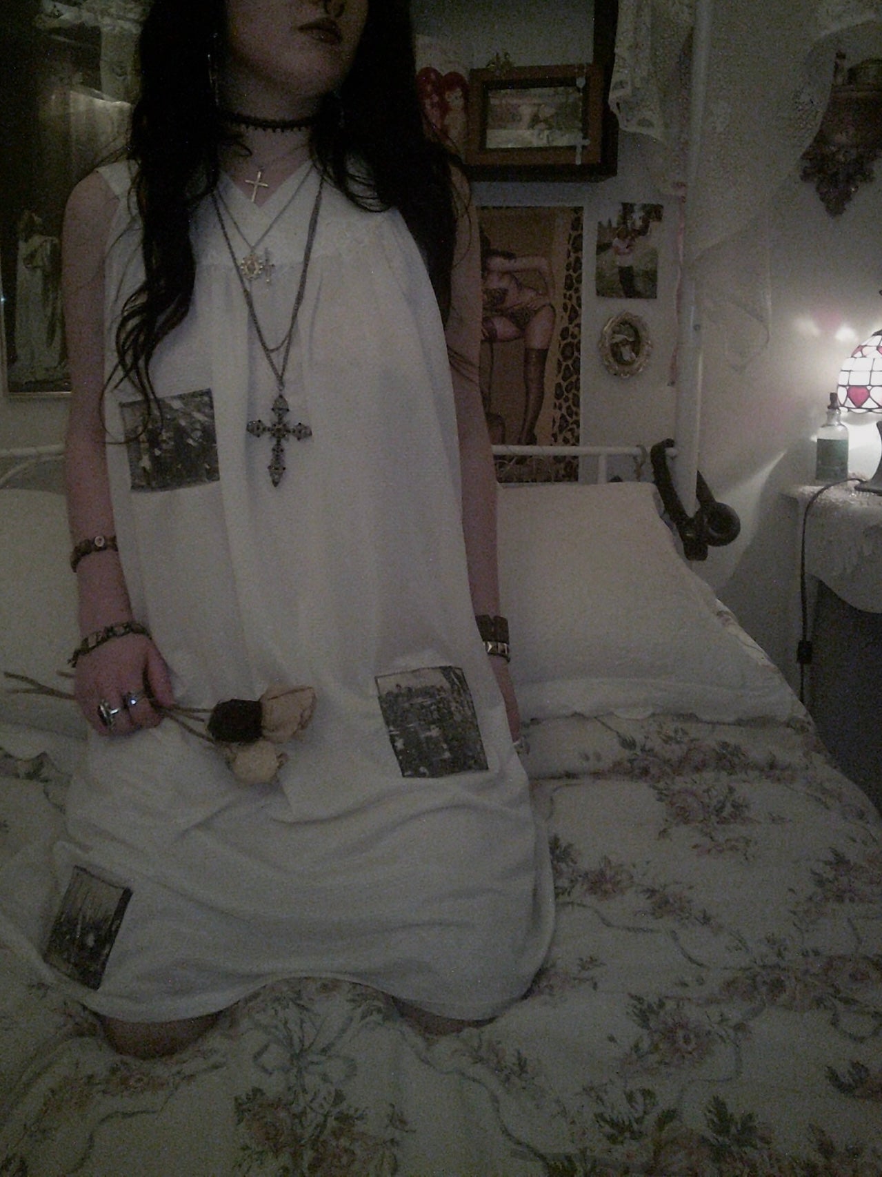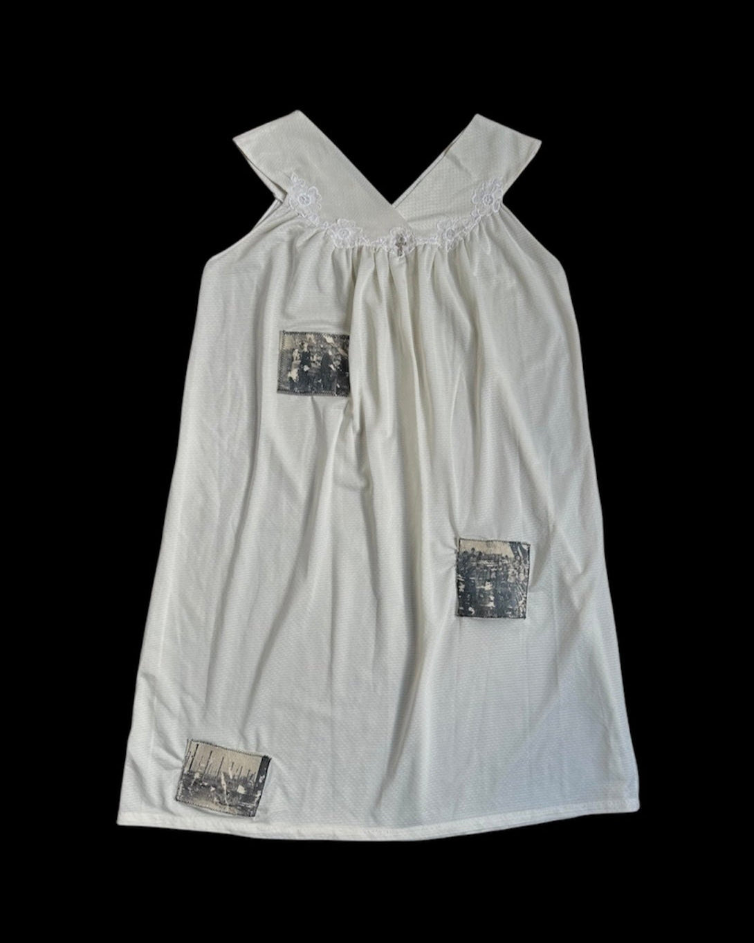 White flowy nightgown with floral detailing, a cross pendant, and three patches made from vintage LIFE magazine photos.