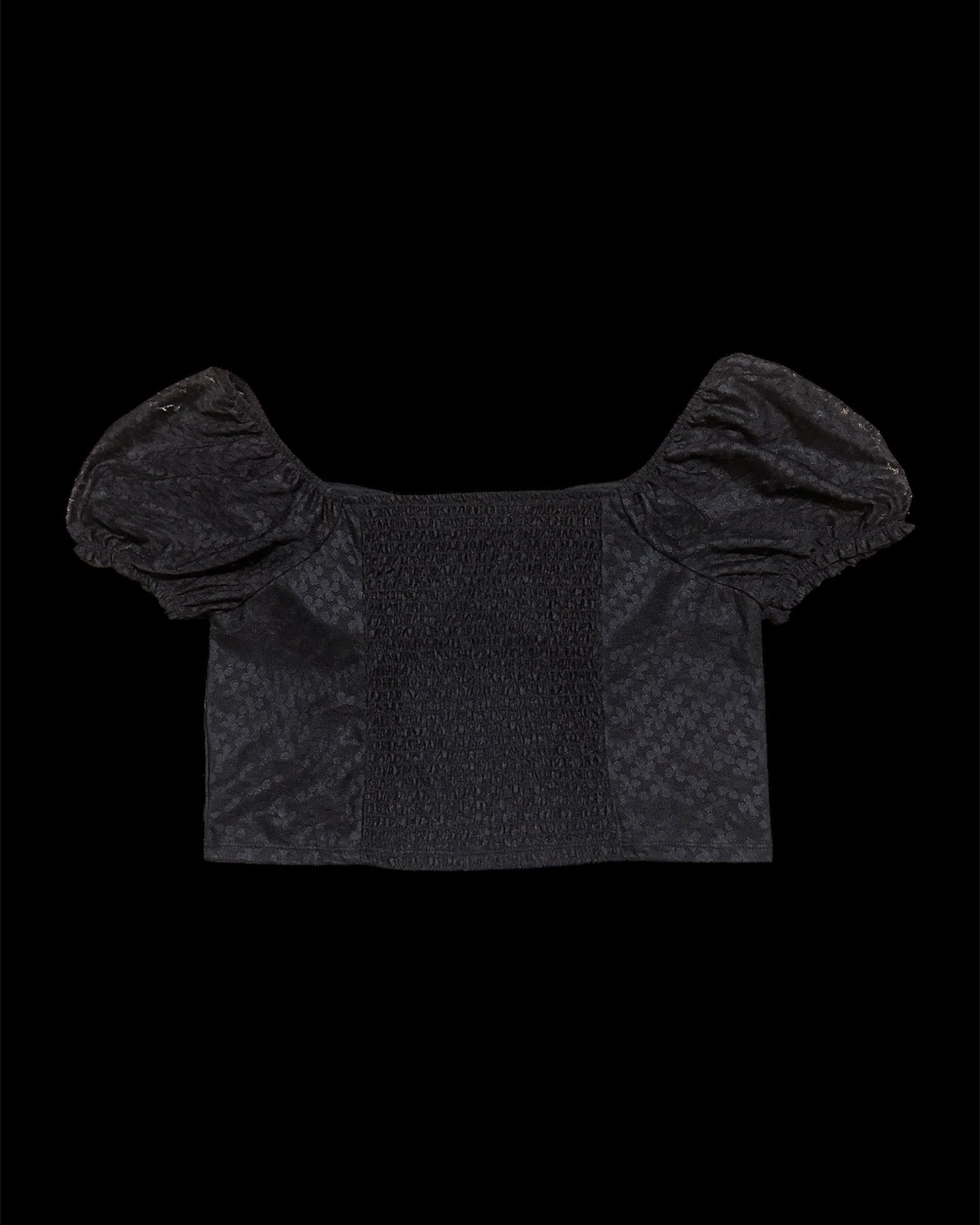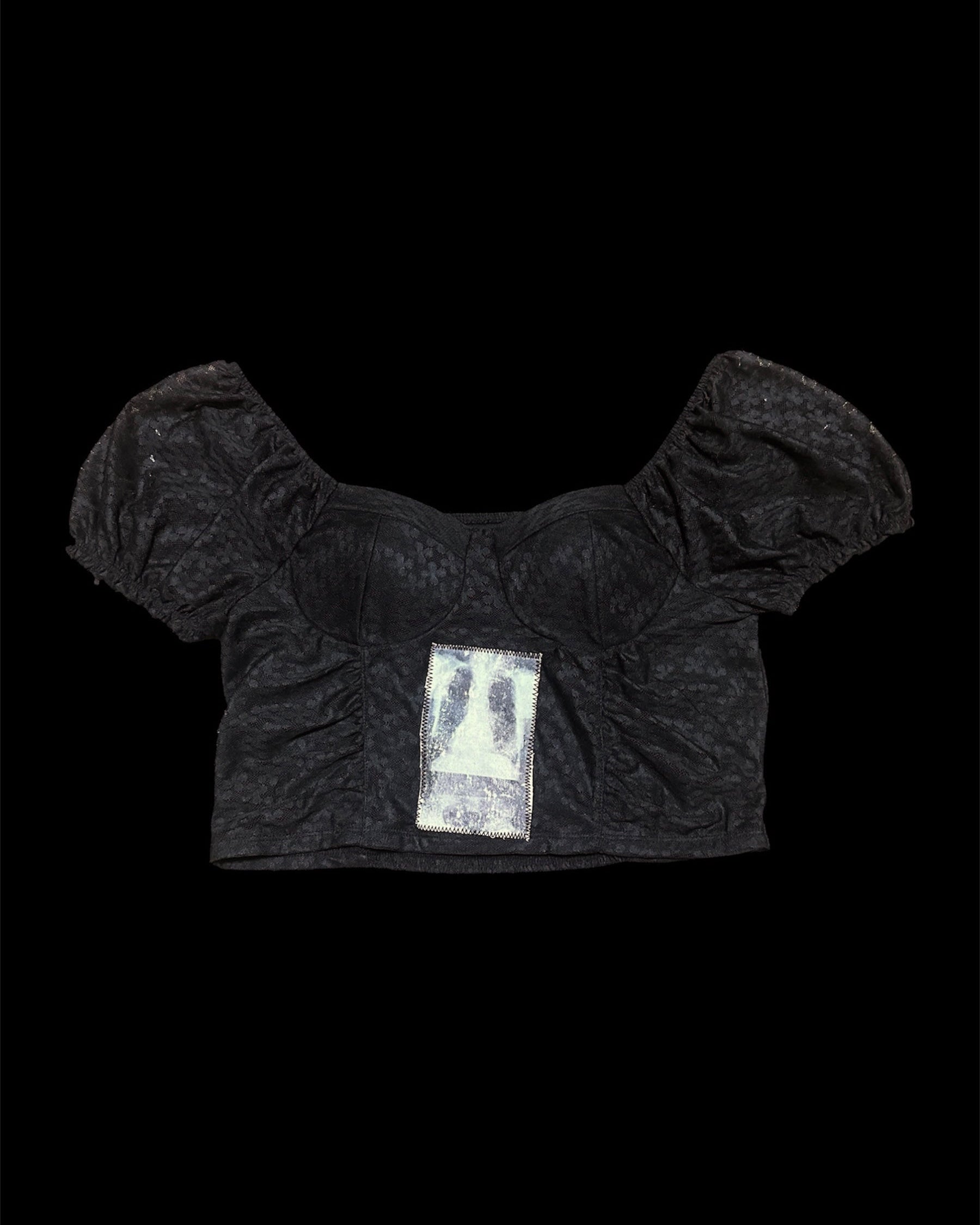 Black floral lace cropped tee with sheer puffy sleeves, padded bust, and a handmade patch made from a vintage LIFE magazine photo.